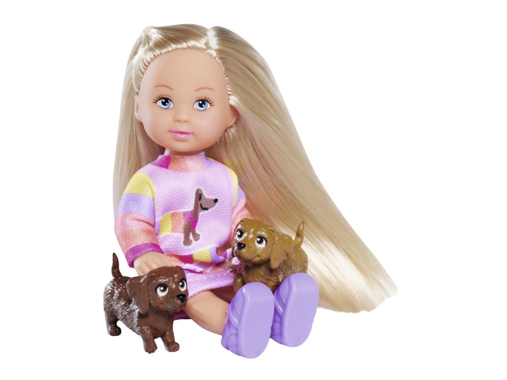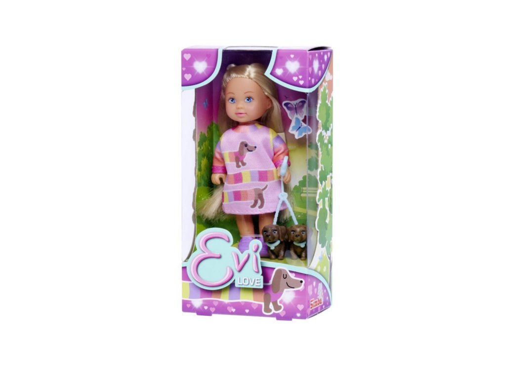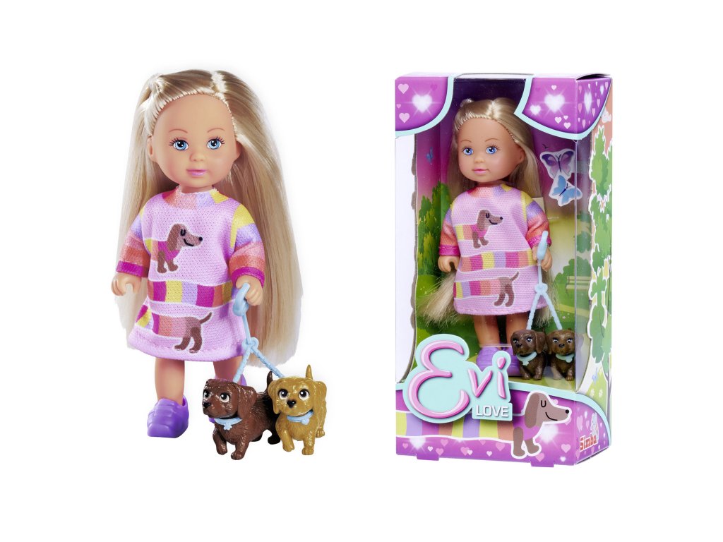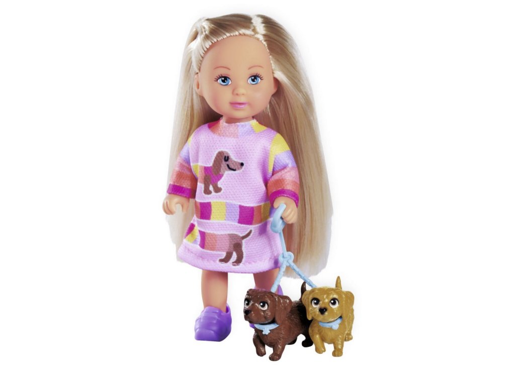 Panenka Evička s 2 pejsky na vodítku. Velikost panenky 12 cm.