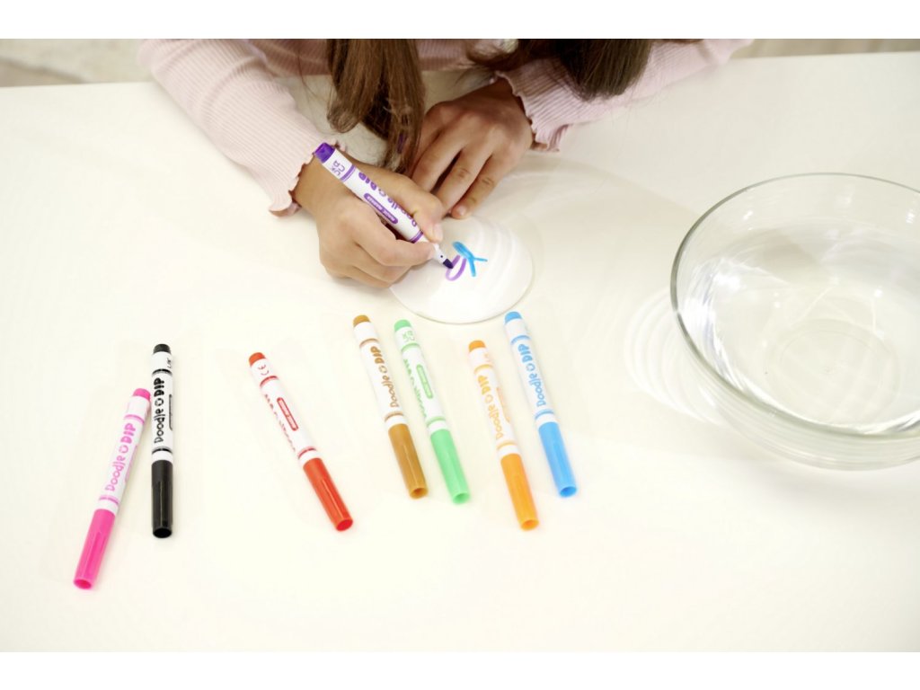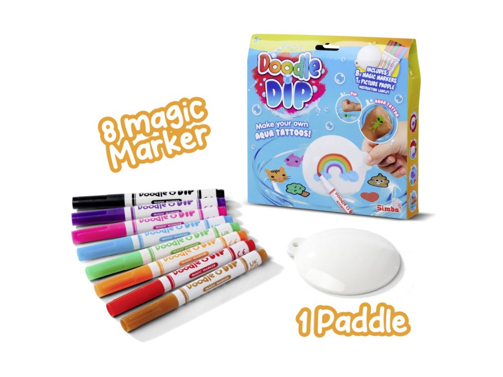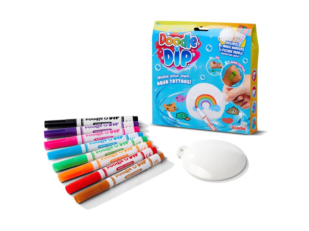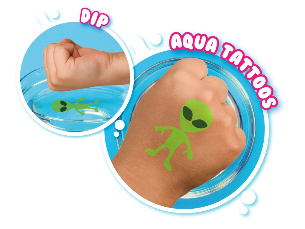 Vyrob si své vlastní vodní tetování. Set pro výrobu tetování obsahuje 8 kouzelných fixů a kreslící podložku. Naklesli obrázek na podložku a opatrně ji vlož do vody, obrázek se ve vodě oddělí od podložky a ty si jej můžeš nalepit na ruku.