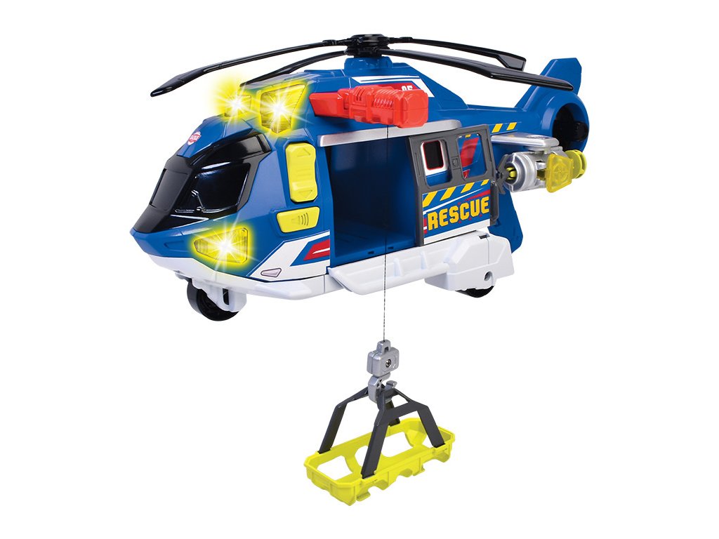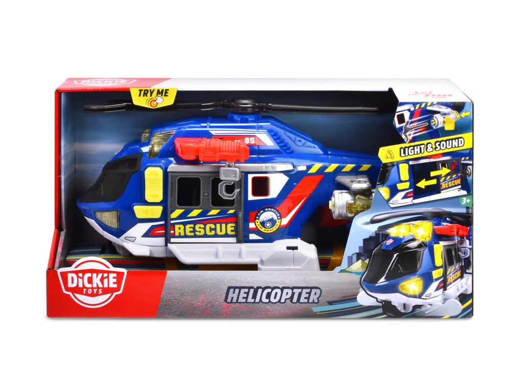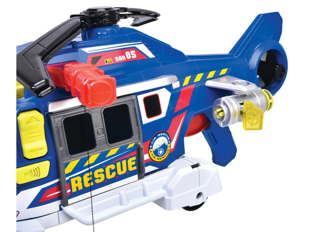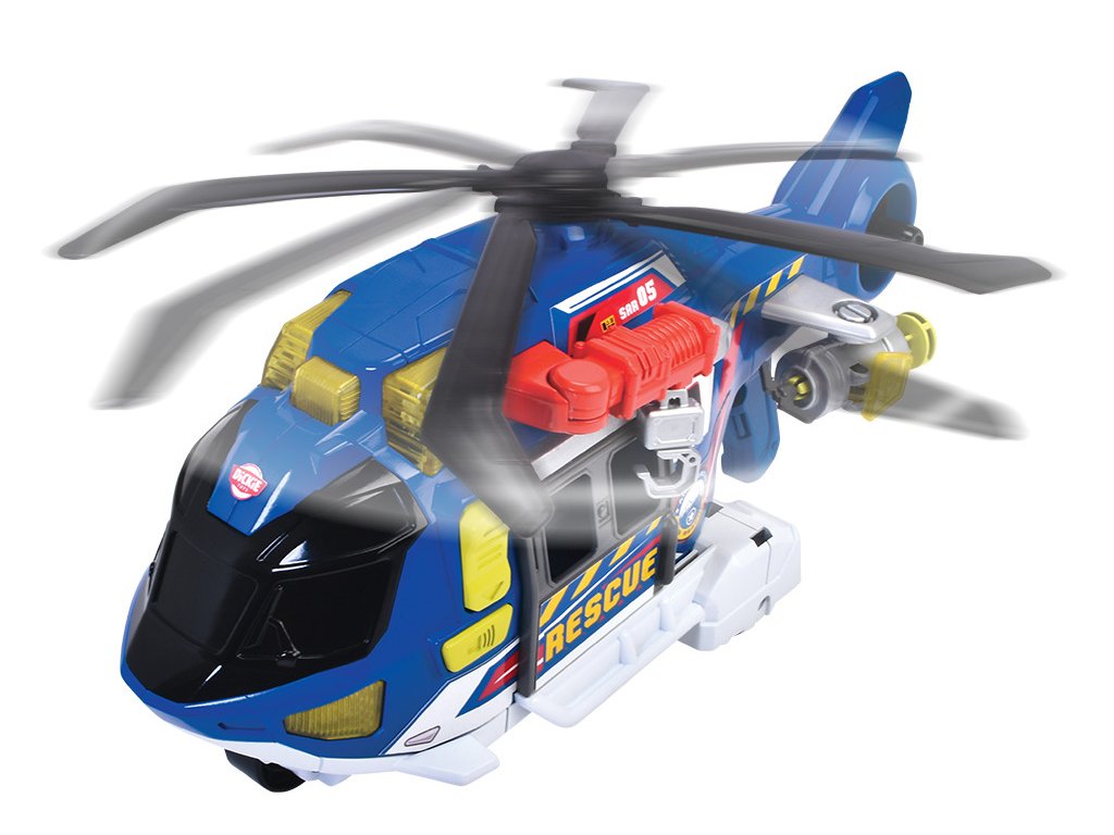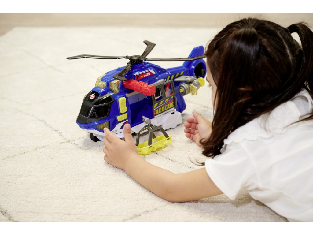 Helikoptéra na volnoběh, světelná a zvuková funkce, mechanický pohyb vrtule, otevírací dveře a pohyblivé části. Součástí je lehátko, které se ovládá tlačítkem (nahoru/dolů). Délka 39 cm.