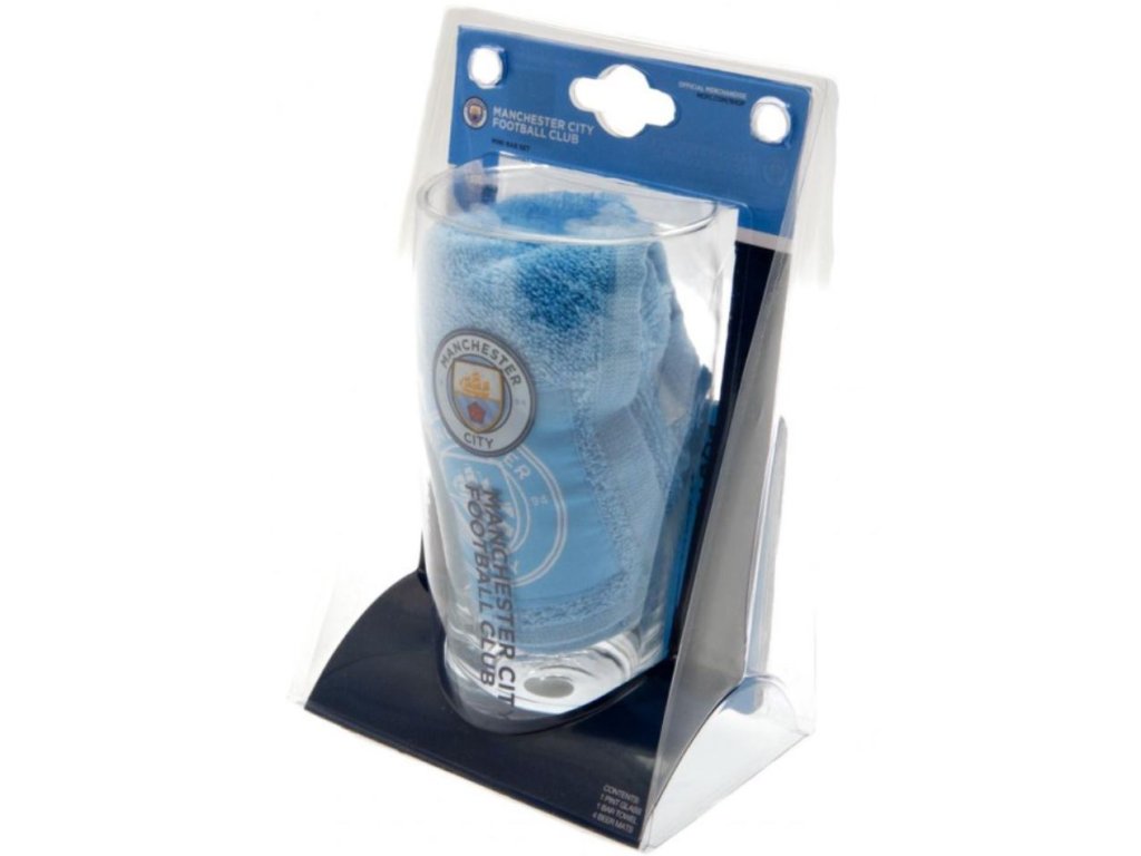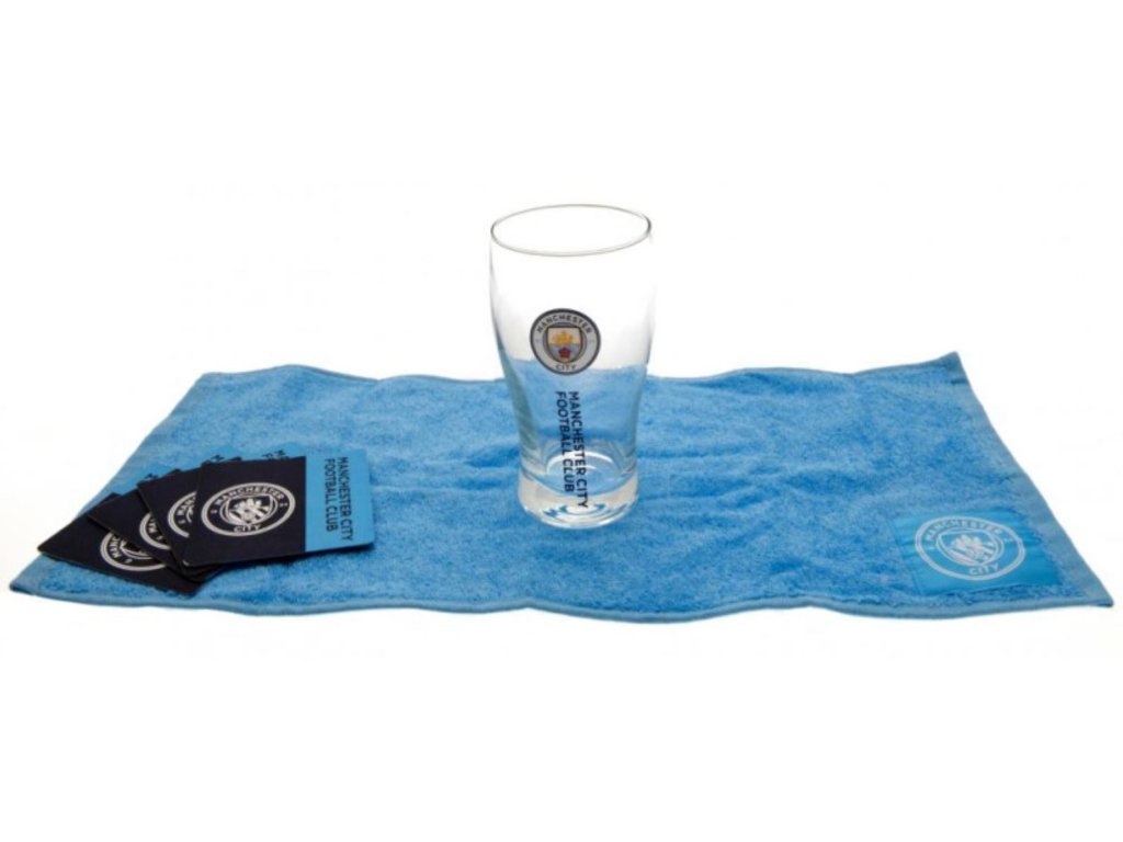 Bar set sklenice s tácky a ručníkem FC Manchester City: Wordmark (objem 470 ml)