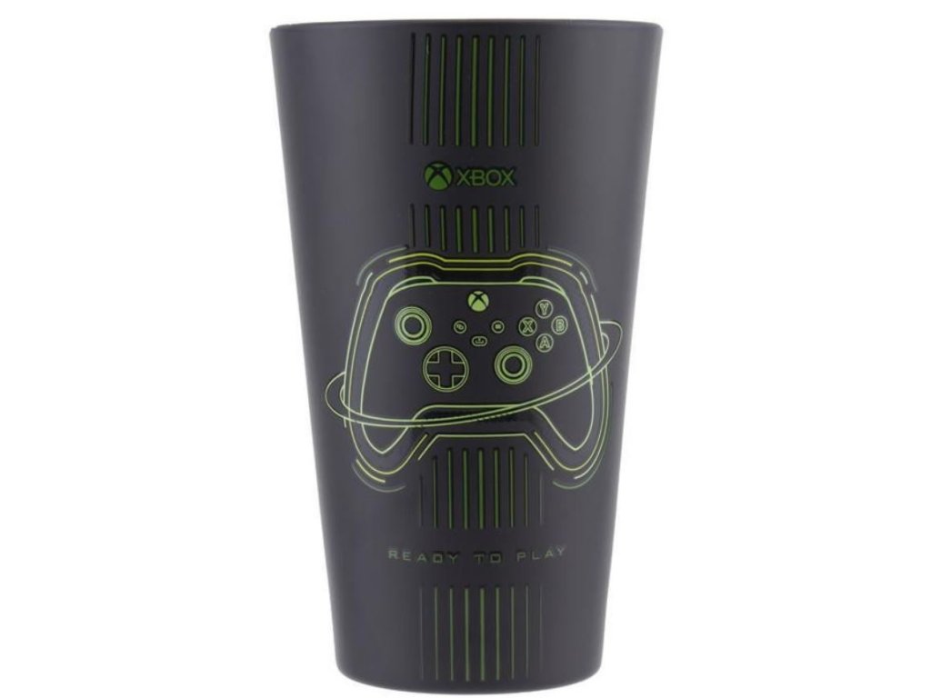 Sklenice na pití má celoobvodově matnou černou s lesklým obtiskem, který obsahuje logo Xbox a vysoce detailní ovladač Xbox zobrazující symboly X, Y, B, A, přepínání zobrazení, mapu/skrytí, levý a pravý joystick, zoom a další.