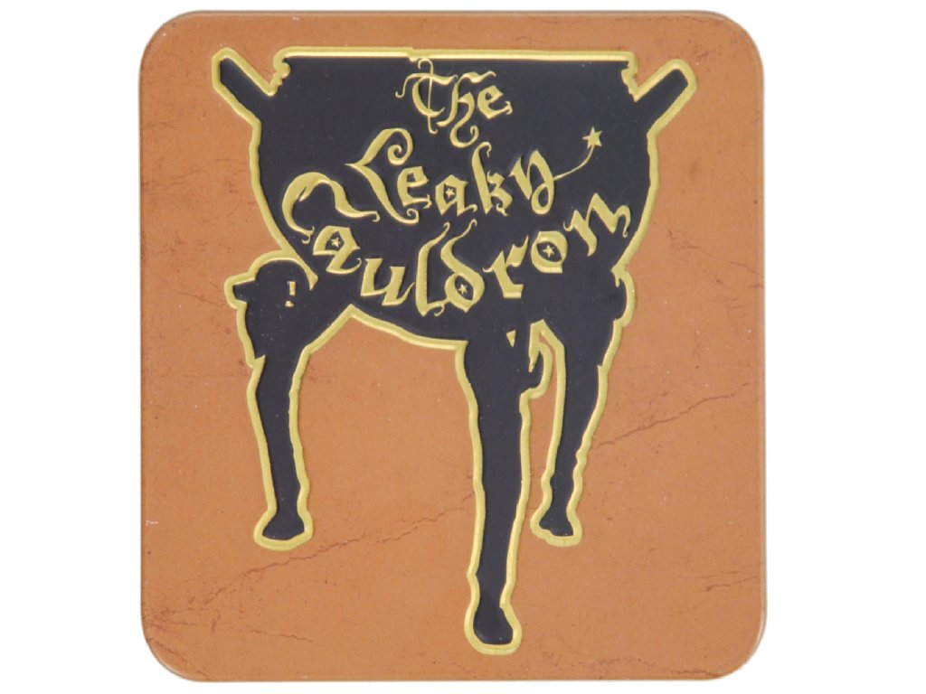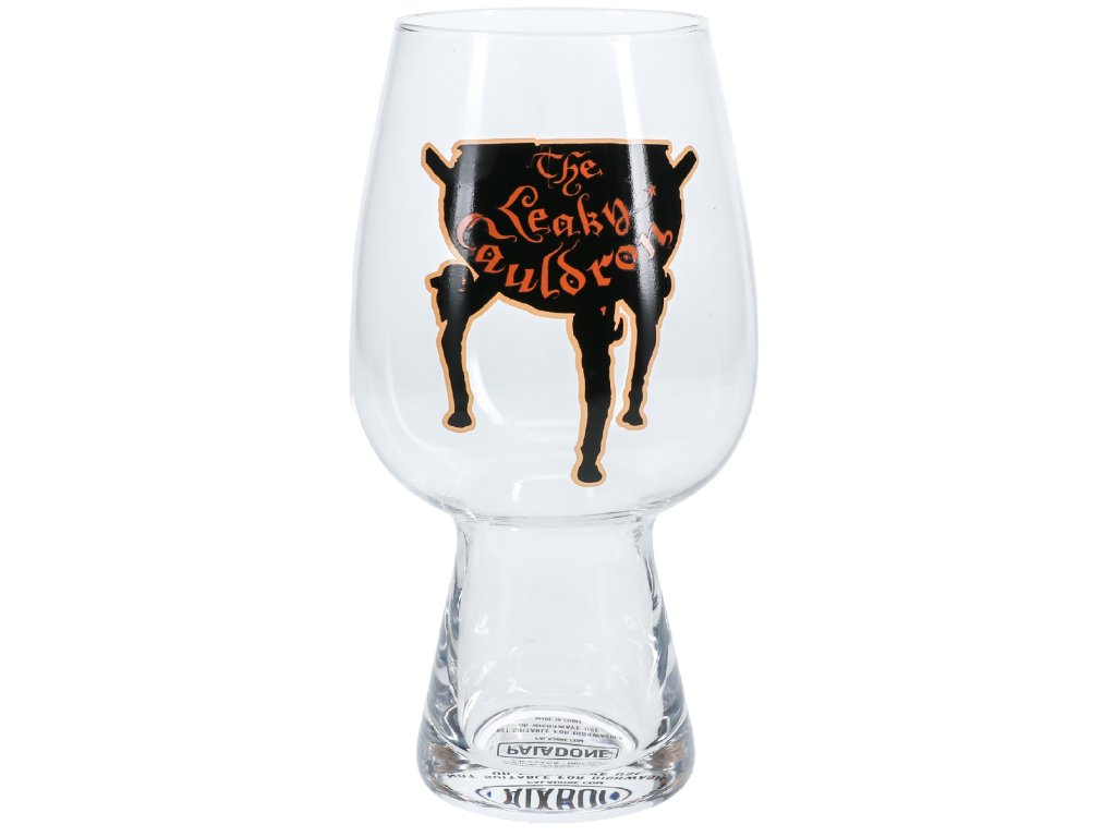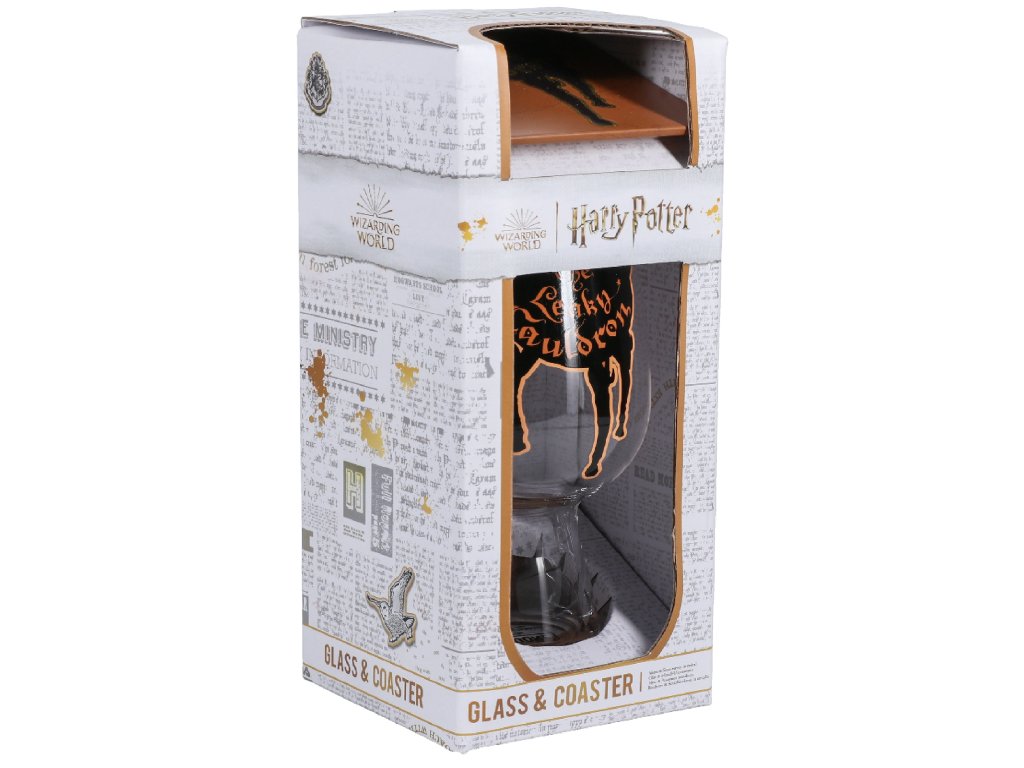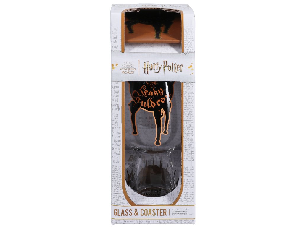 Stylová sklenice vyvedená v motivu oblíbené kouzelnické hospody v Londýně Leaky Cauldron (Děravý kotel). Byl to vchod do Příčné ulice. Tácek pod sklenici má stejné provedení jako sklenice.