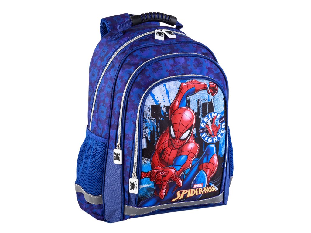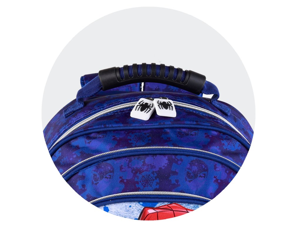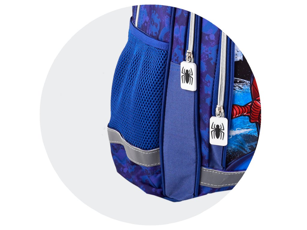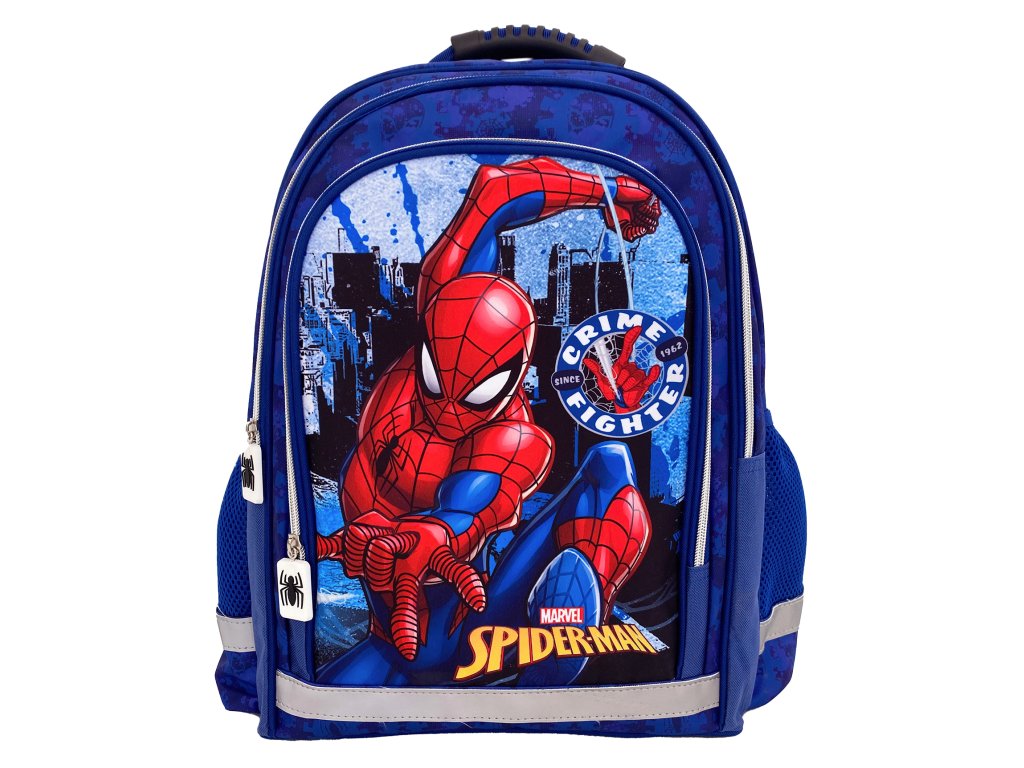 Modrý školní batoh s barevnými detaily vyvedený s grafikou Spidermana, který je bojovník se zločinem. Batoh má jednu hlavní kapsu a 2 přední menší kapsy se zapínáním na zip, do kterých si snadno uložíte vše potřebné. Samozřejmostí je ucho pro snadné nošení v ruce, boční síťované kapsy na pití, možnost připevnění vozíku, ergonomicky tvarovaná záda a délkově nastavitelné ramenní popruhy.