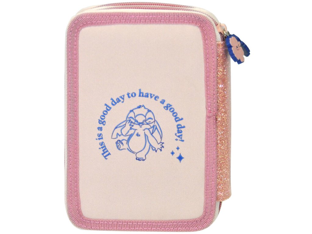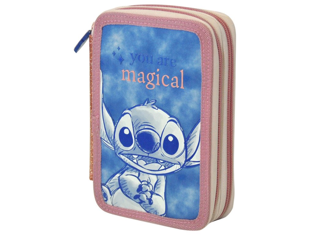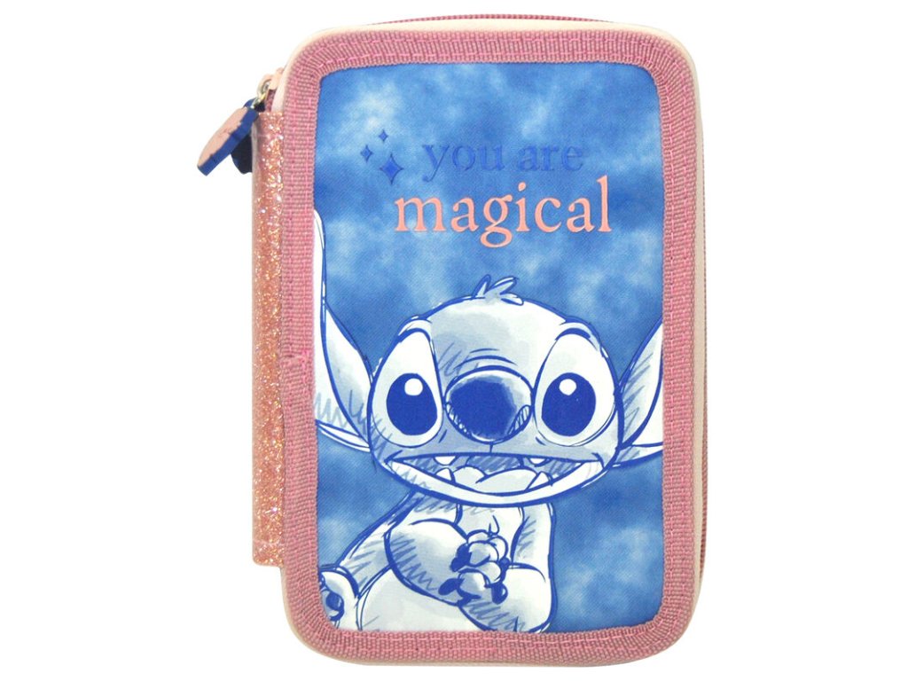 Dvoupatrové pouzdro školní ve starorůžovo-modré barvě s barevnými prvky vyvedenými s grafikou Stitche. Zapínání pouzdra je na zip. Pouzdro je skvělým pomocníkem fanoušků pohádky Lilo & Stitch!