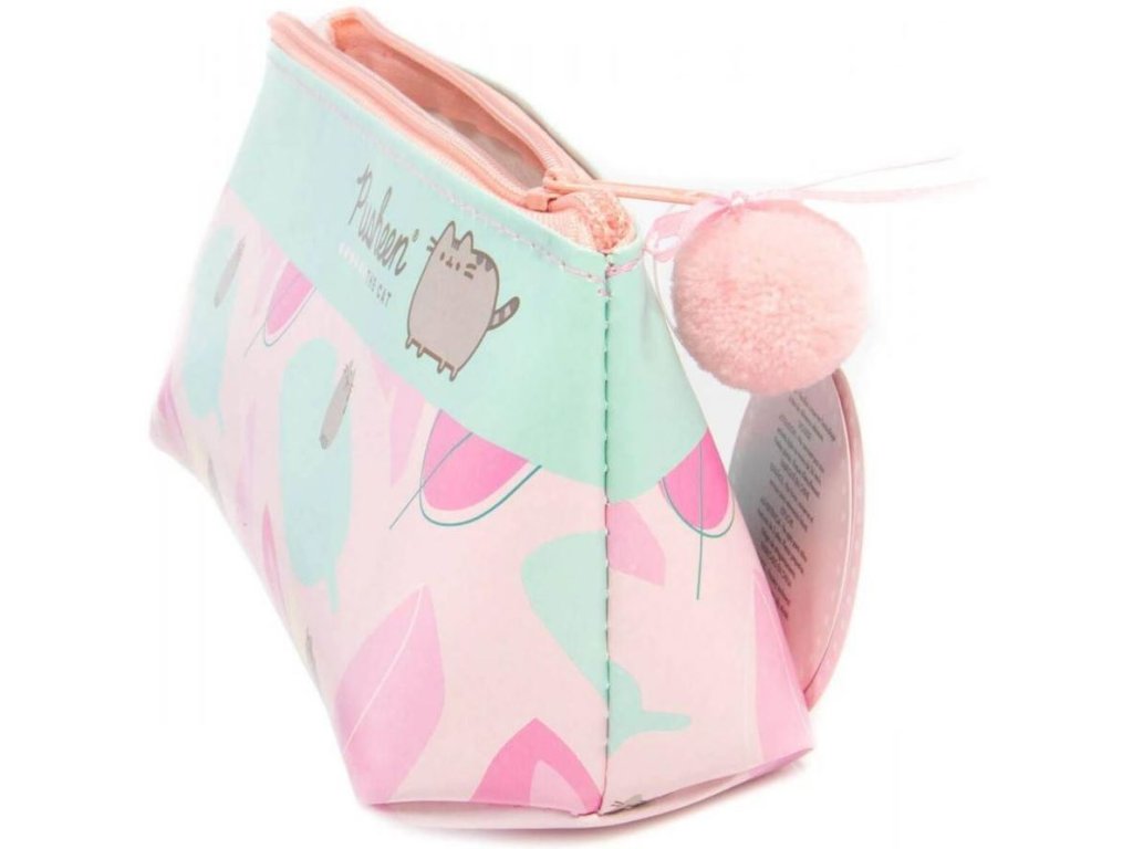 Světle růžový školní penál na tužky na zip s bambulkou inspirovaný kočkou Pusheen, kterou vytvořili tvůrci Claire Belton a Adrew Duff v roce 2010. Jméno Pusheen pochází z irského slova "puisin" v překladu kotě.