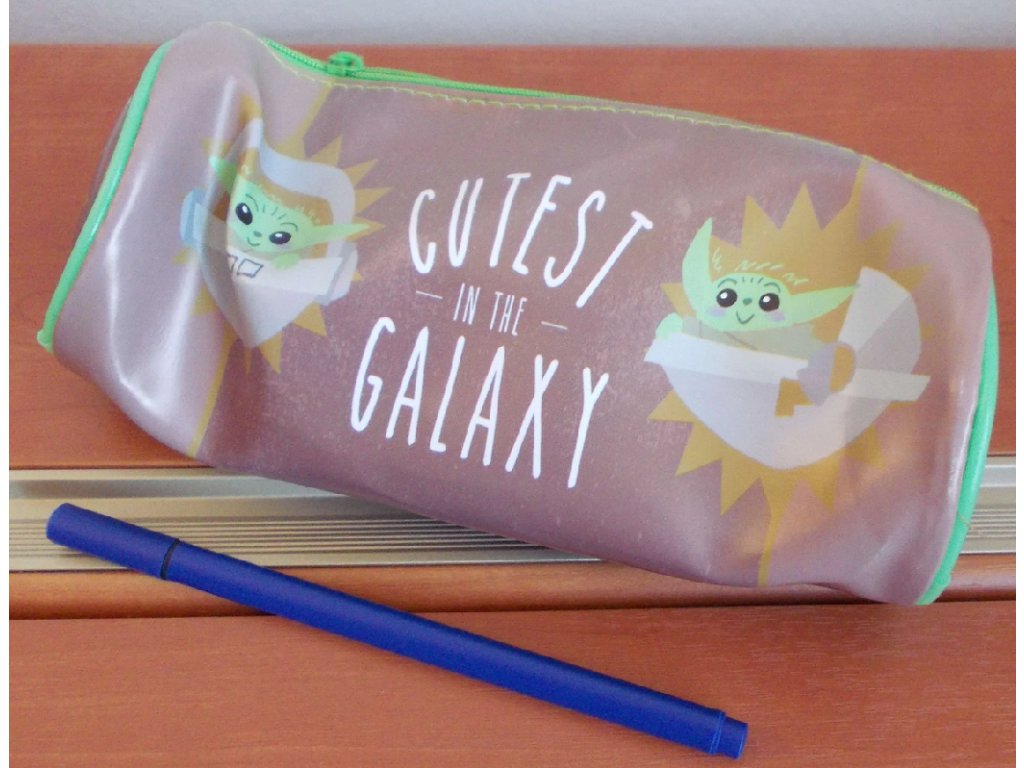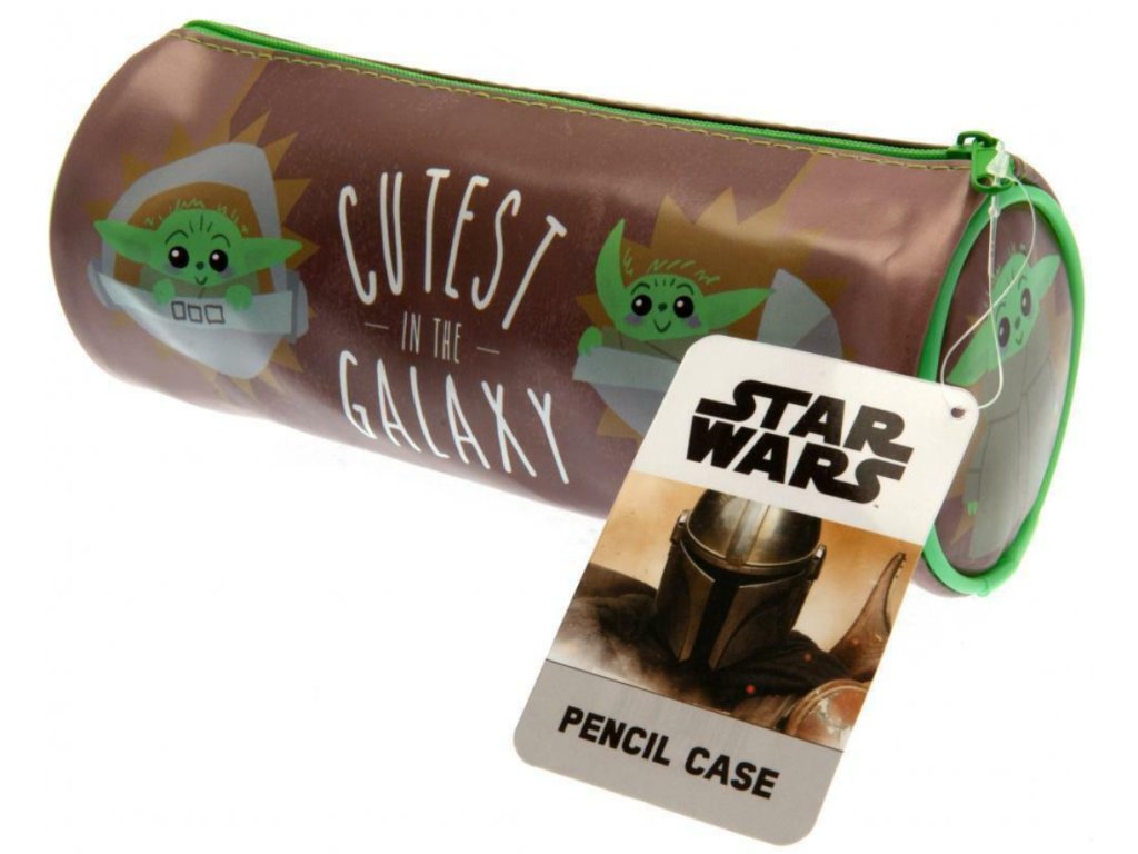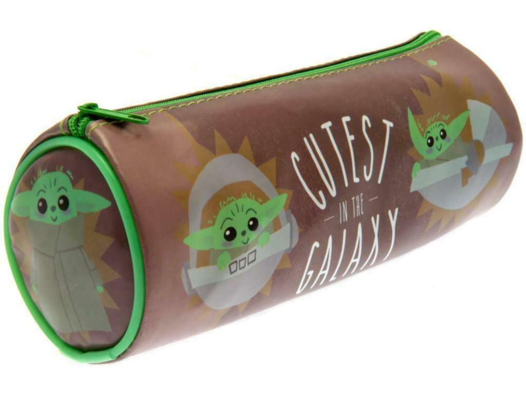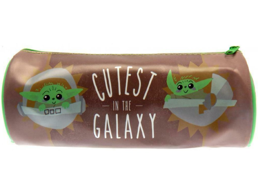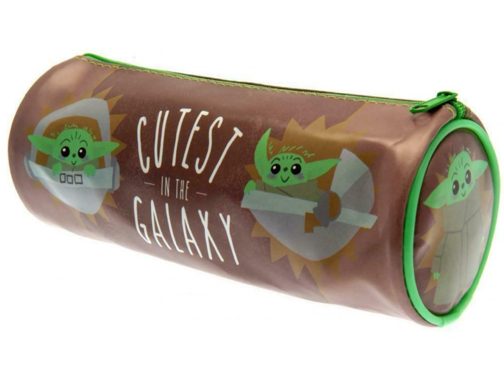 Hnědý školní penál na tužky ve tvaru barelu s motivem Baby Yoda a nápisem Cutest in the Galaxy.