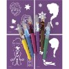 Balení obsahuje 6 barevných foukacích fixů s potiskem a 4 barevné papírové šablonky v oblíbených pohádkových motivech.