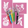 Balení obsahuje 6 barevných foukacích fixů s potiskem a 4 barevné papírové šablonky v oblíbených pohádkových motivech.