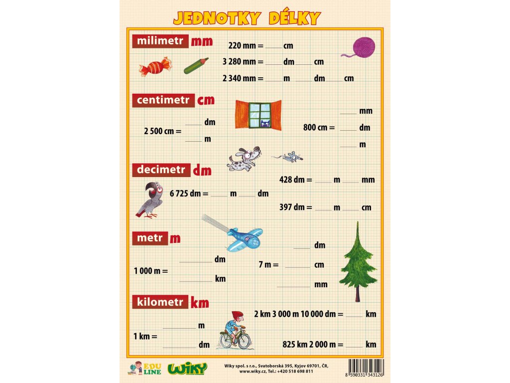 Zadní strana obsahuje názorné úlohy na procvičování převodu jednotek délky.