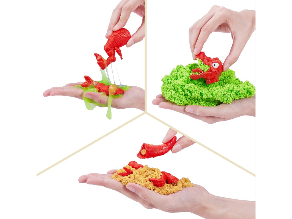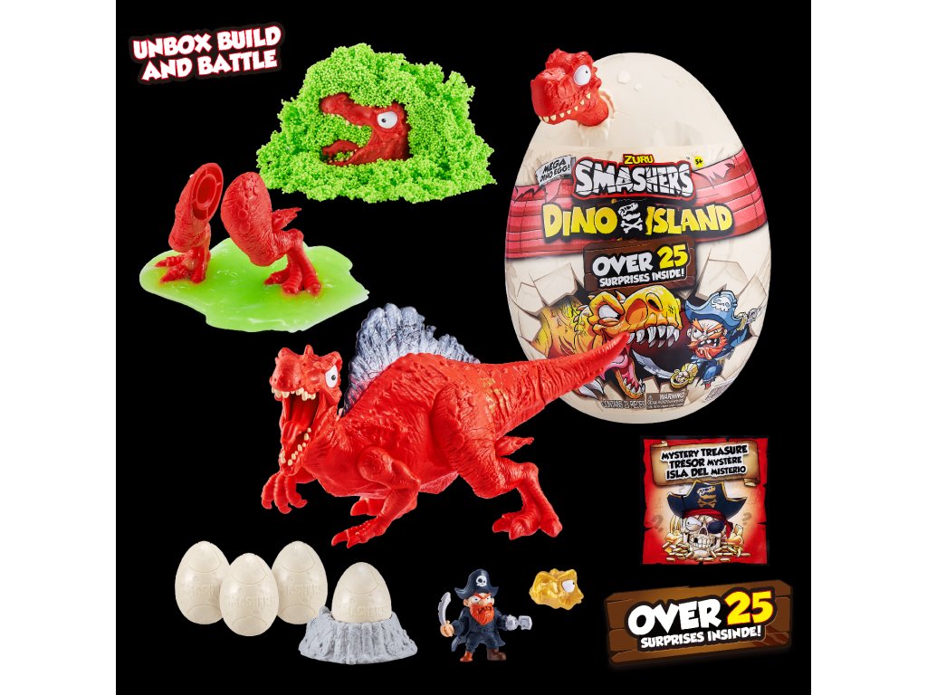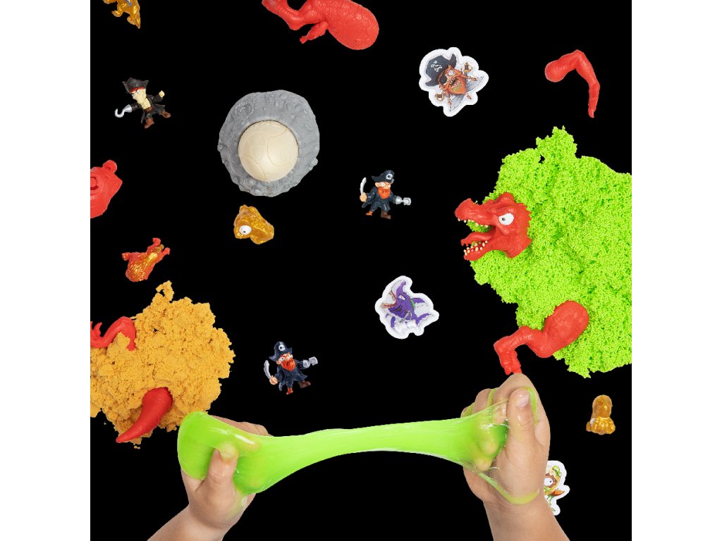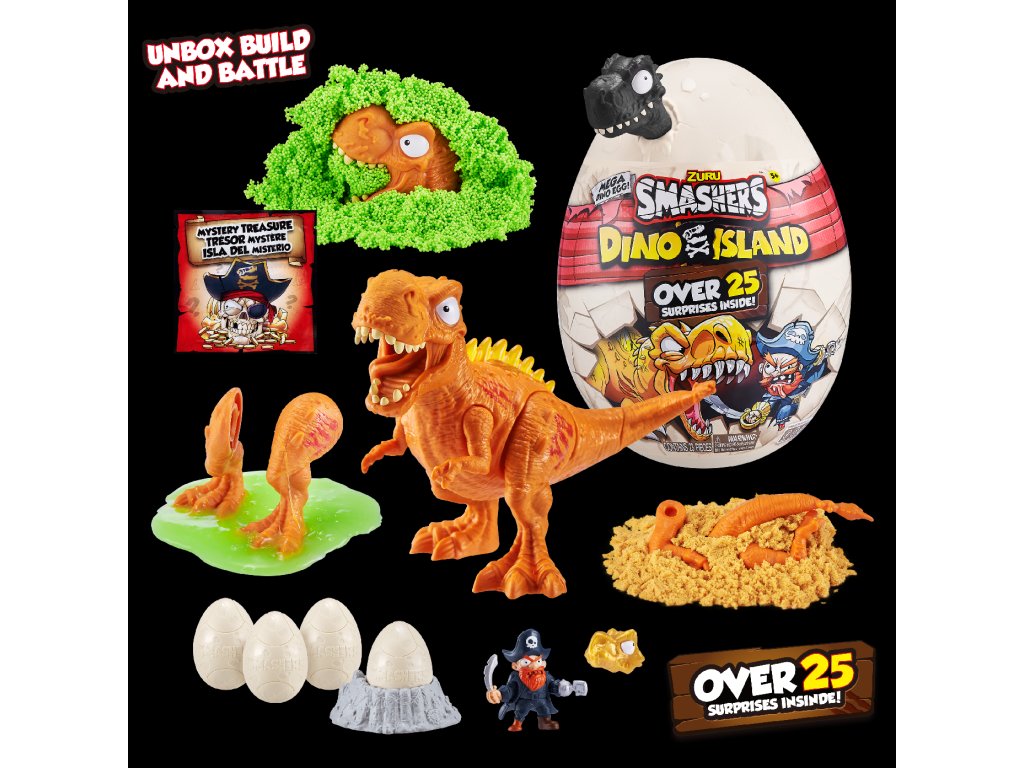 Hledejte své dino kousky v pěně z cukrové vaty, mačkavém písku a super elastickém slizu! Cestou narazíte na figurku piráta a 4 epická mini vejce, která obsahují další exkluzivní figurky!