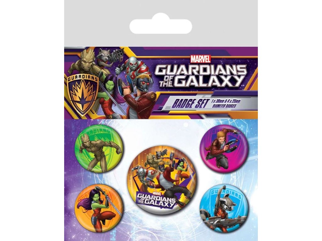 Oficiální produkt - set 5 kusů odznaků z katalogu zboží s licencí a grafikou populární filmové ságy Guardians of the Galaxy (Strážci galaxie).
