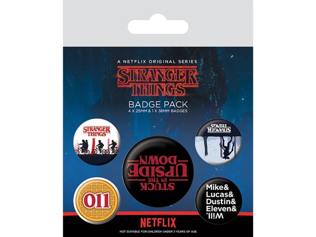 Balení pěti kusů placek s barevnou grafikou Stranger Things.