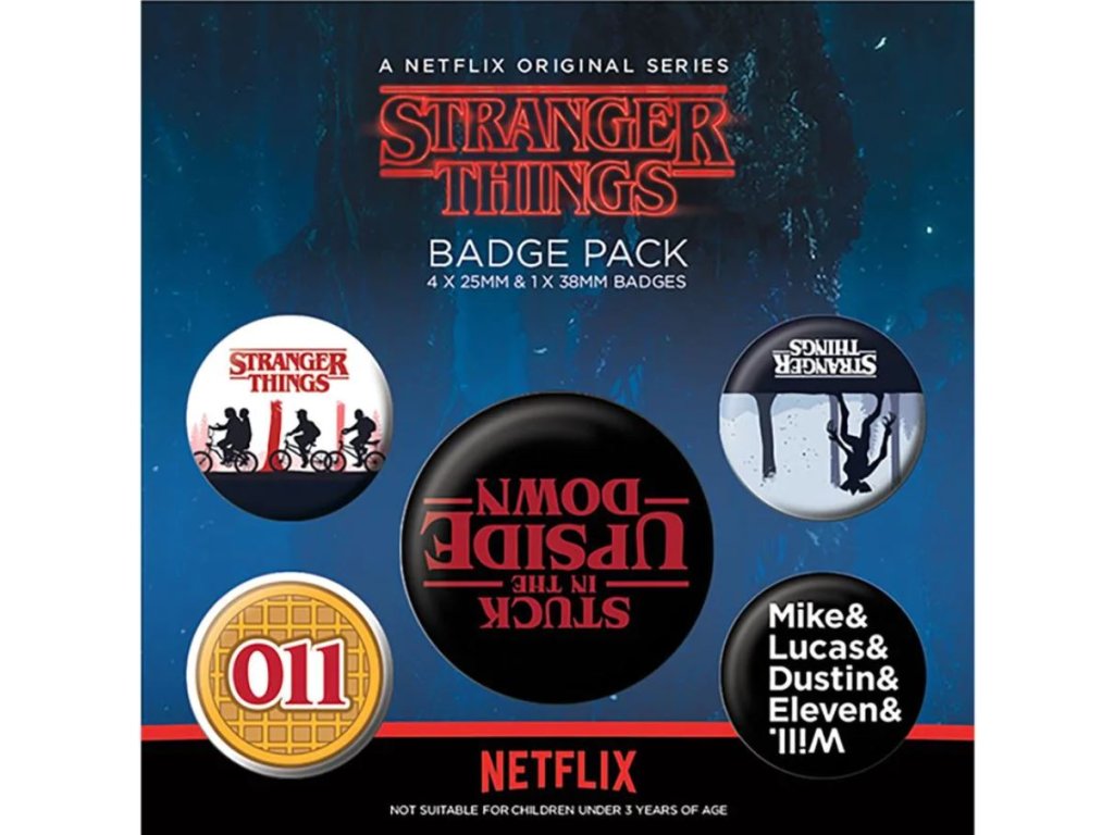 Oficiální placky z katalogu produktů s logem a grafikou Stranger Things.