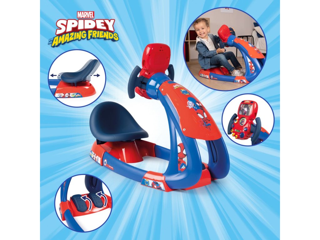 Trenažér pro malé řidiče s motivem Spideyho a jeho kamarád- Pohodlná a nastavitelná sedačka - 3 polohy, mechanické pedály, elektronický volant s rolovací mapou, podsvícení displeje, 15 zvuků aut a Spideyho webu, funkce boost, zpátečka. Rozměry: 85 x 50 x 36 cm. Hmotnost 2,55 kg. Max. nosnost 50 kg.