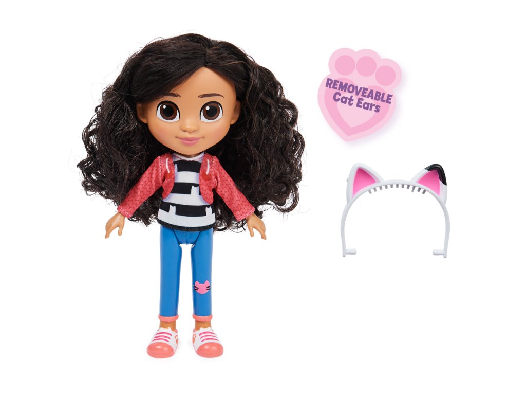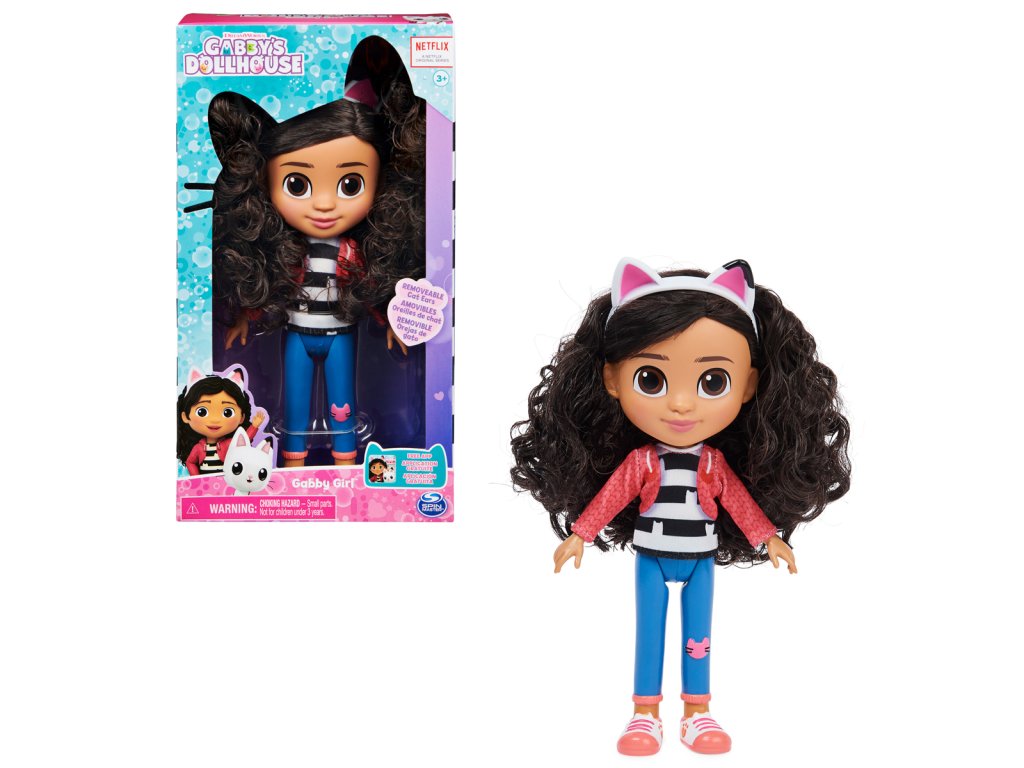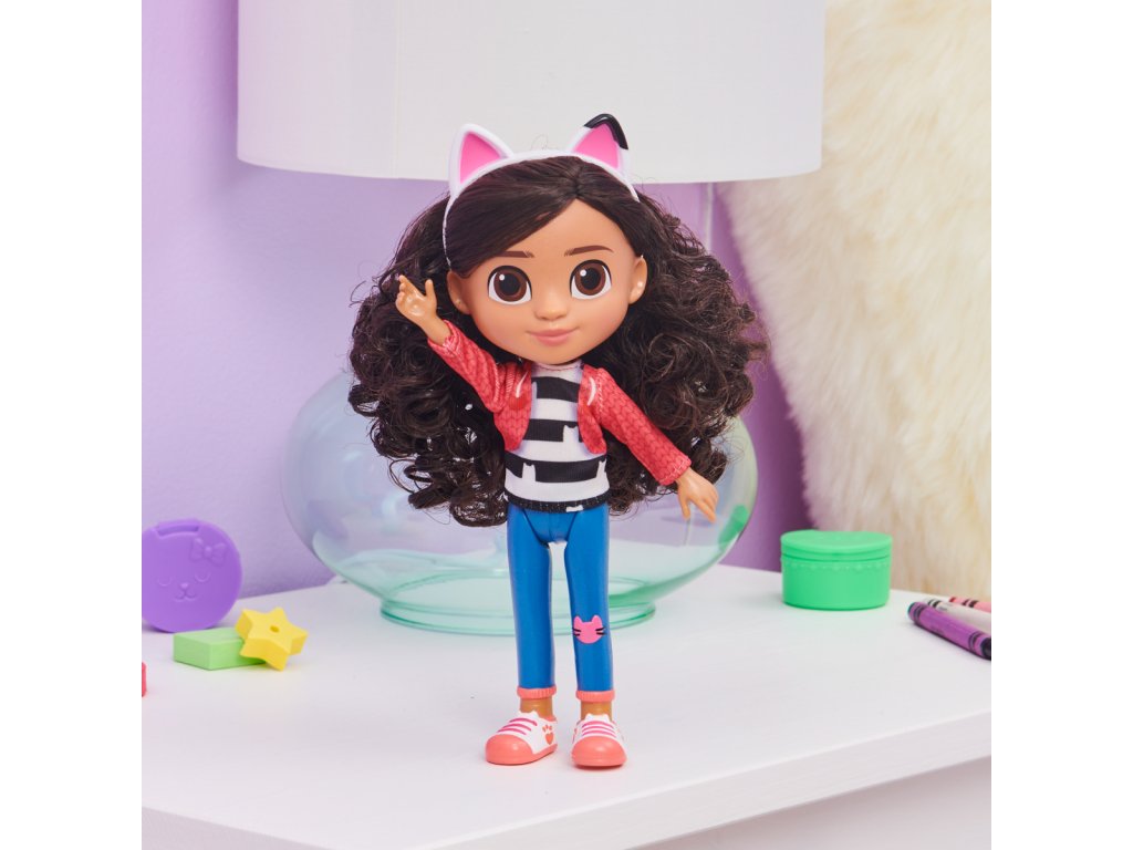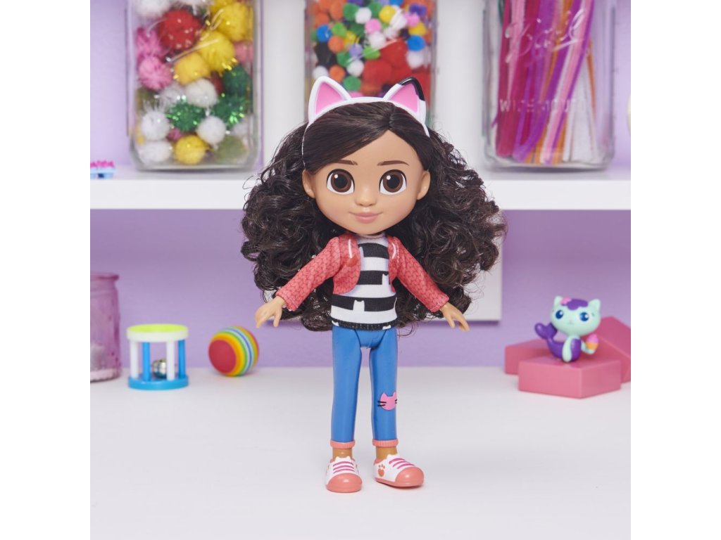 Gabby česací paneka je 20 cm veliká. Má oblečení ze seriálu a čelenku s kočičíma ušima. Čelenku můžes sundat a poté učesat Gábince hebké a vlnité vlasy. Vhodné od 3 let.