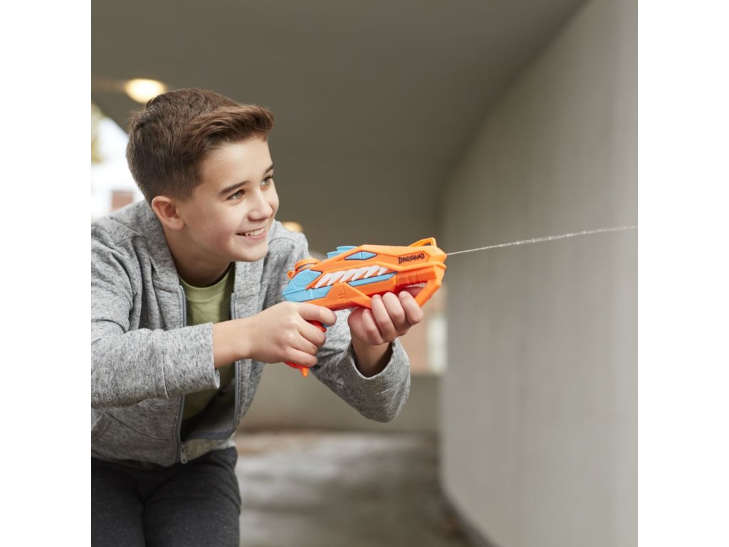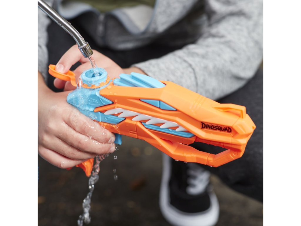 Rozbalte to s vodními blástry Nerf Super Soaker! Tyhle venkovní hračky nejsou jen pro děti, skvěle se s nimi vyřádí i dospělí. Rozšiřte řady elitní jednotky DinoSquad a spojte síly s legendárními dinosaury! Využijte mimořádnou sílu dinosauřích titánů a zažijte s nimi úžasná dobrodružství! Vodní blástr Nerf DinoSquad Raptor-Surge zachycuje vzhled dinosaura Velociraptora a je příslibem opravdu divoké letní zábavy. Proud vody tryská přímo z dinosauří tlamy. Otevřete uzávěr, naplňte zásobník vodou, zavřete uzávěr a stisknutím spouště vypustíte silný proud vody.