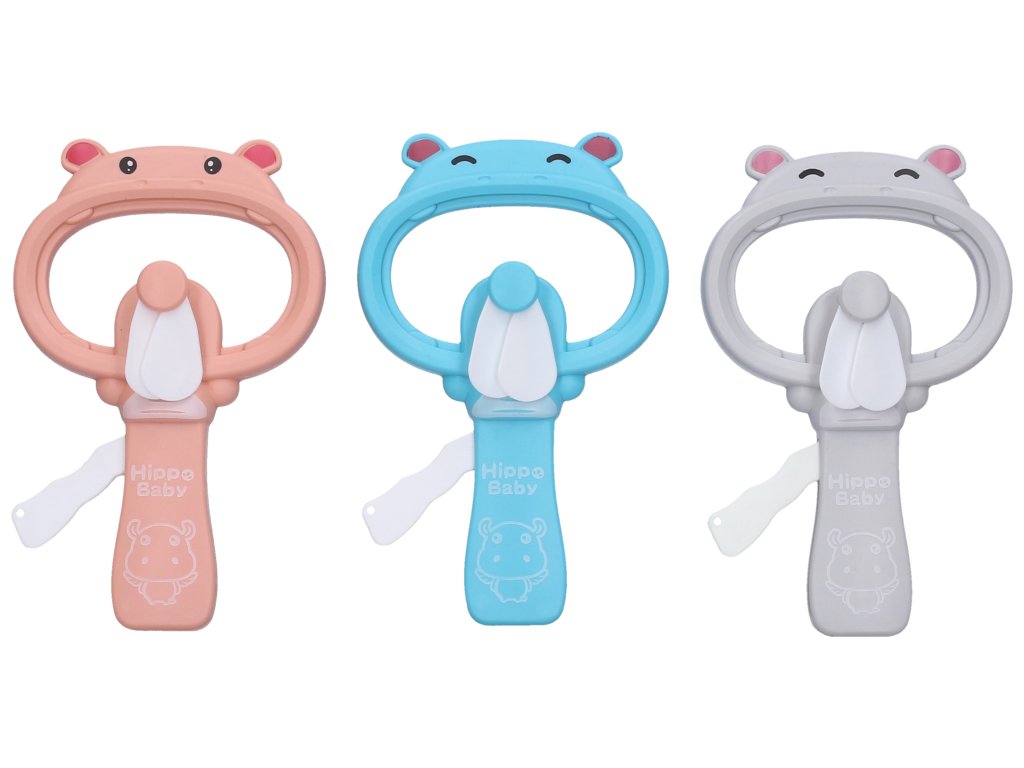 Ruční větráček hroch. Přesné rozměry 10x4x18. Větráček se roztáčí manuální páčkou. Display box - 12 ks. 3 varianty - modrá, červená, šedá.