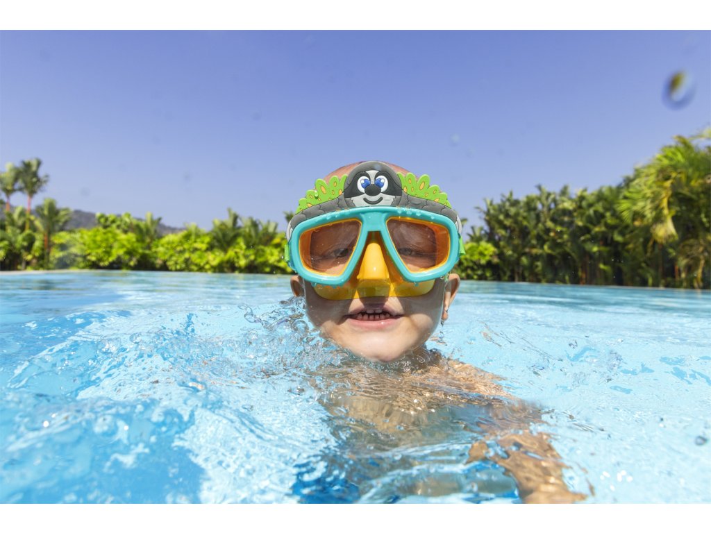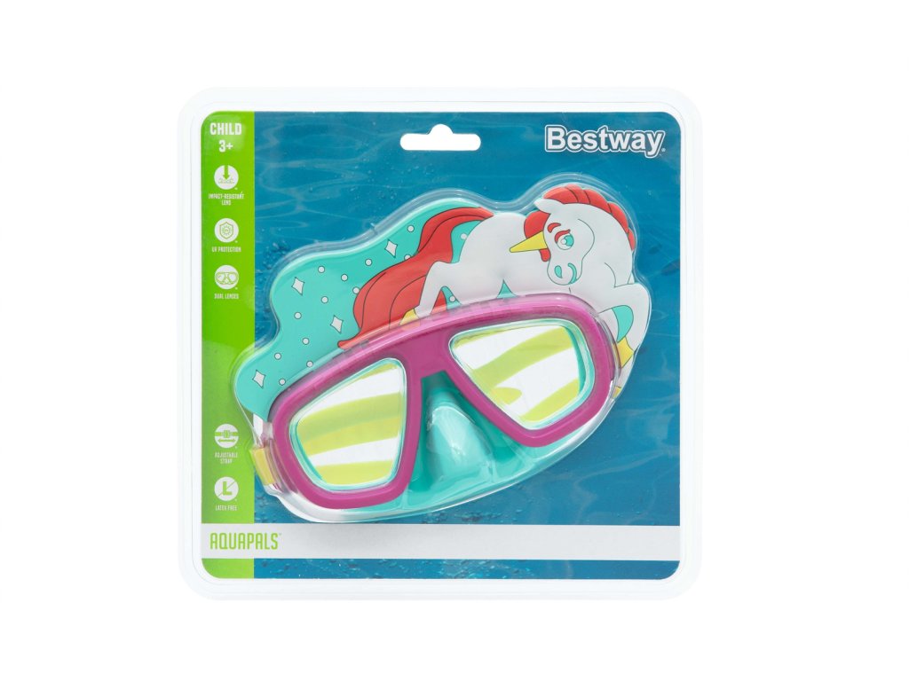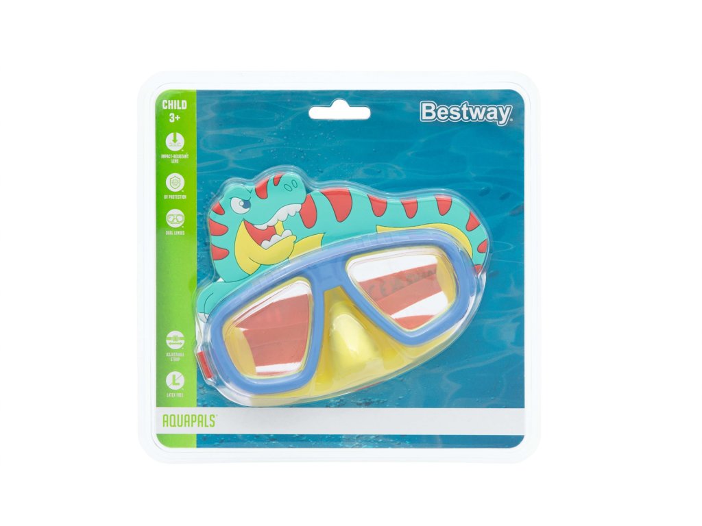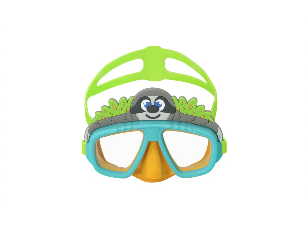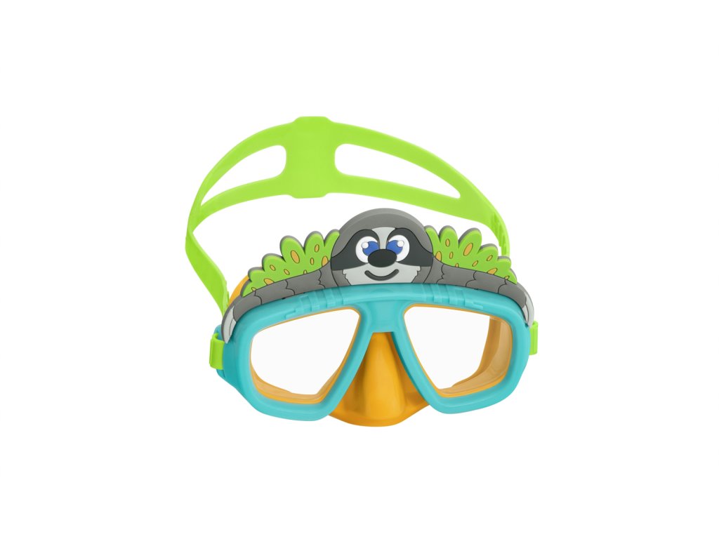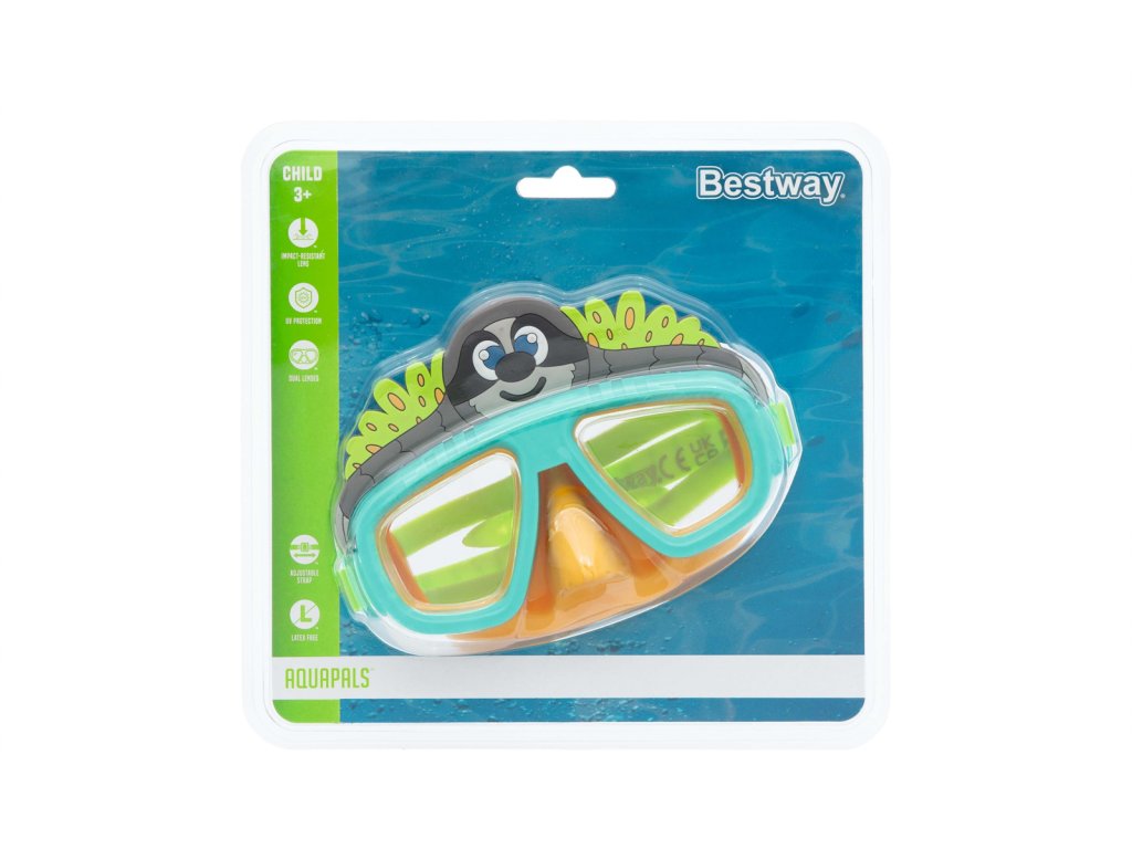 Šnorchlovací maska Aquapals. Brýle mají polykarbonátové čočky s ochranným povrchem chránícím proti UV záření. Dvojitý lem pro přesné přitisknutí a zabránění průsaku. Plně nastavitelný dělený náhlavní pásek. Šnorchl má měkký a pohodlně přiléhající náustek. 3 barevné provedení v podobě zvířat. 100 % bez latexu. Věk: 3+