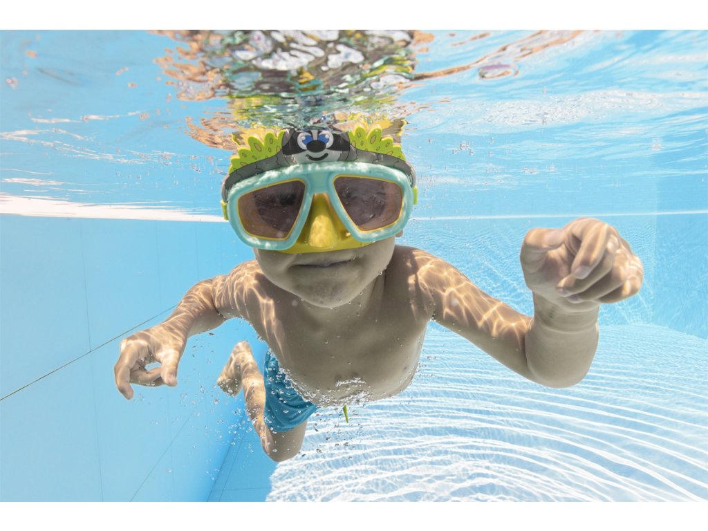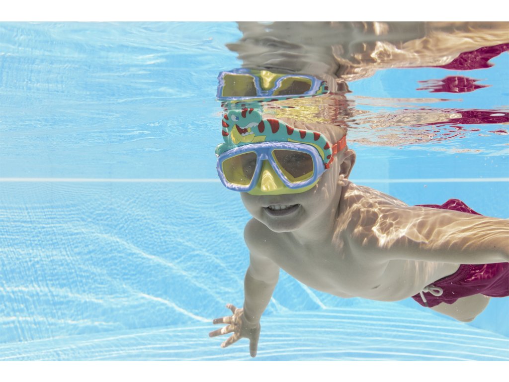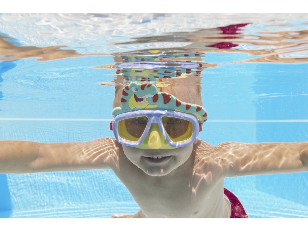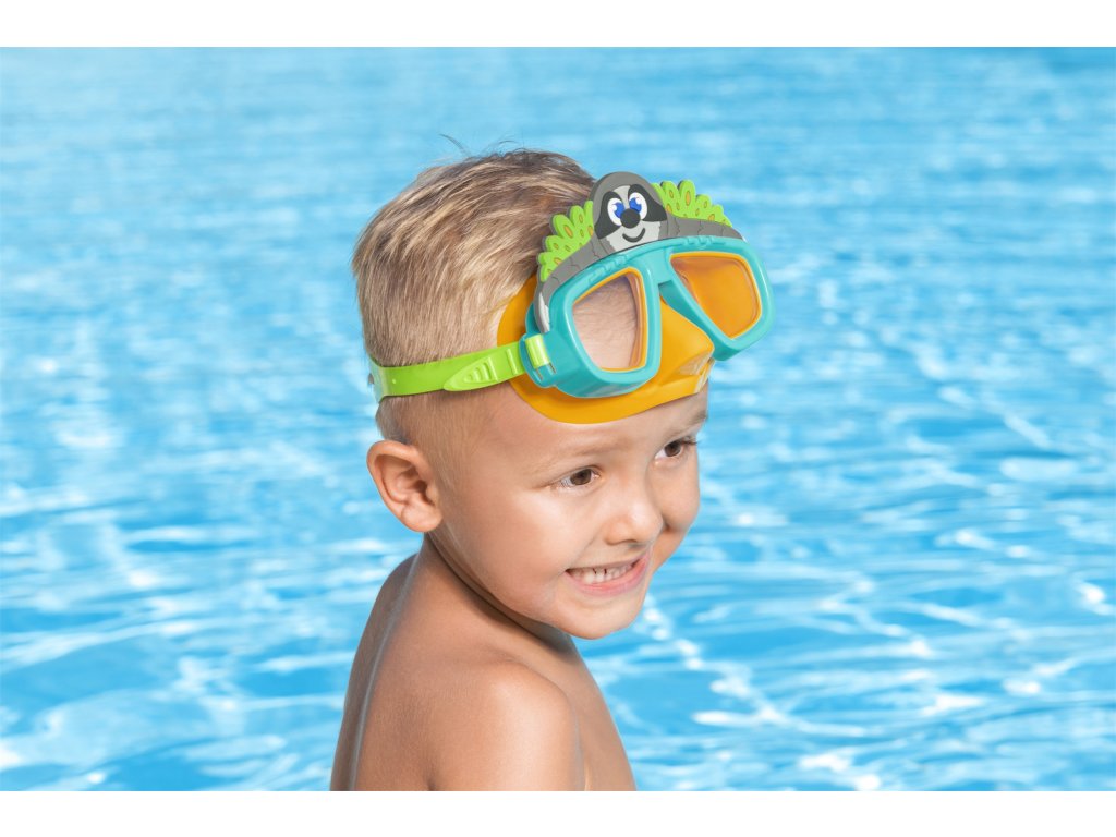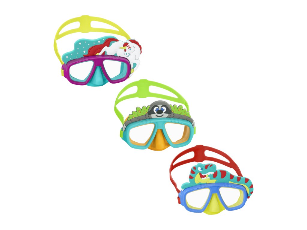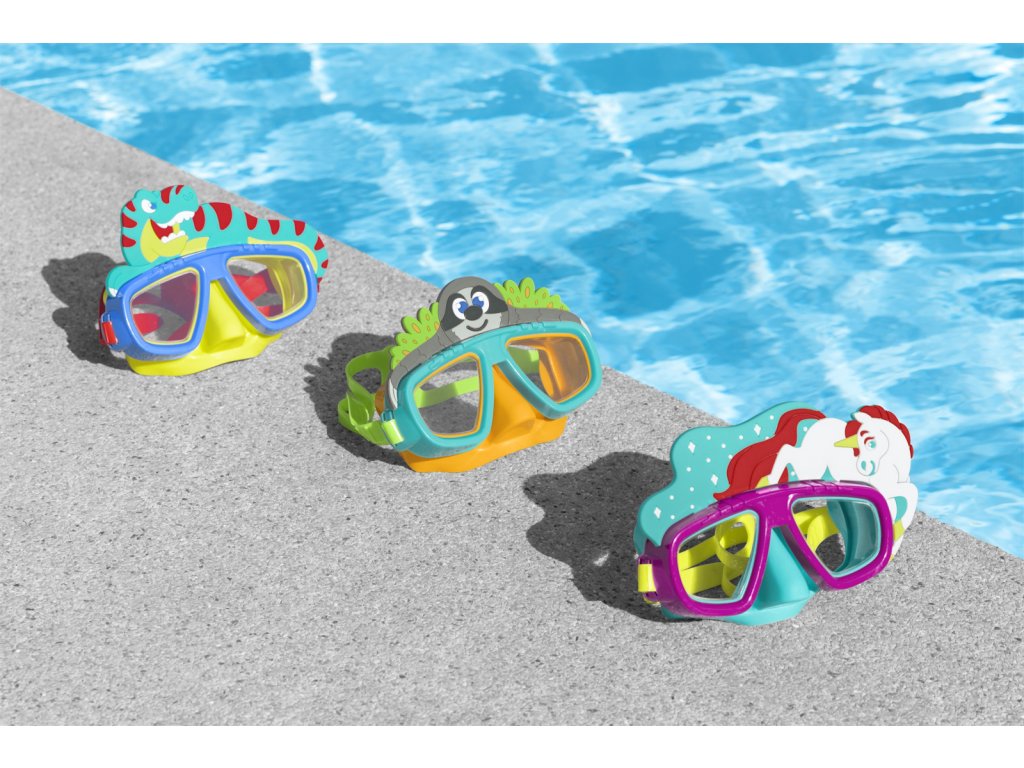 Šnorchlovací maska Aquapals. Brýle mají polykarbonátové čočky s ochranným povrchem chránícím proti UV záření. Dvojitý lem pro přesné přitisknutí a zabránění průsaku. Plně nastavitelný dělený náhlavní pásek. Šnorchl má měkký a pohodlně přiléhající náustek. 3 barevné provedení v podobě zvířat. 100 % bez latexu. Věk: 3+