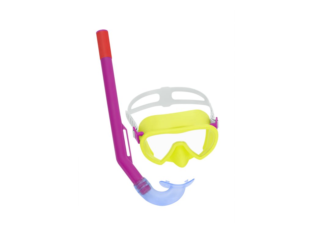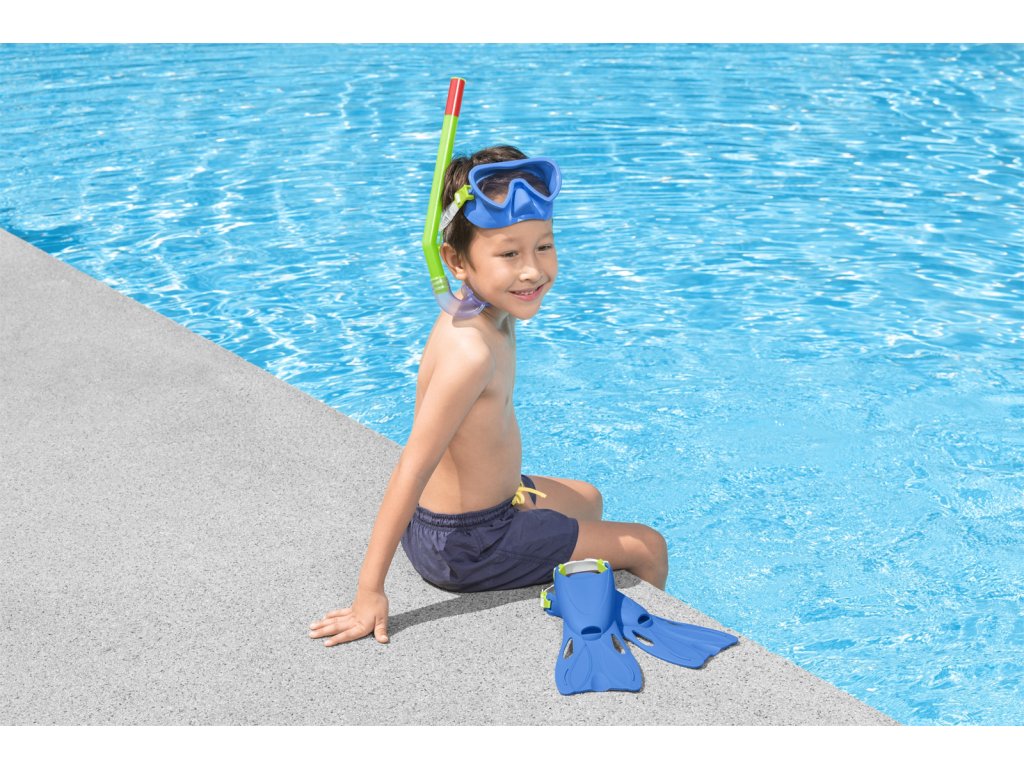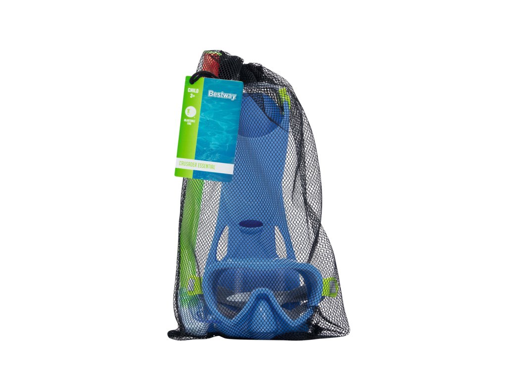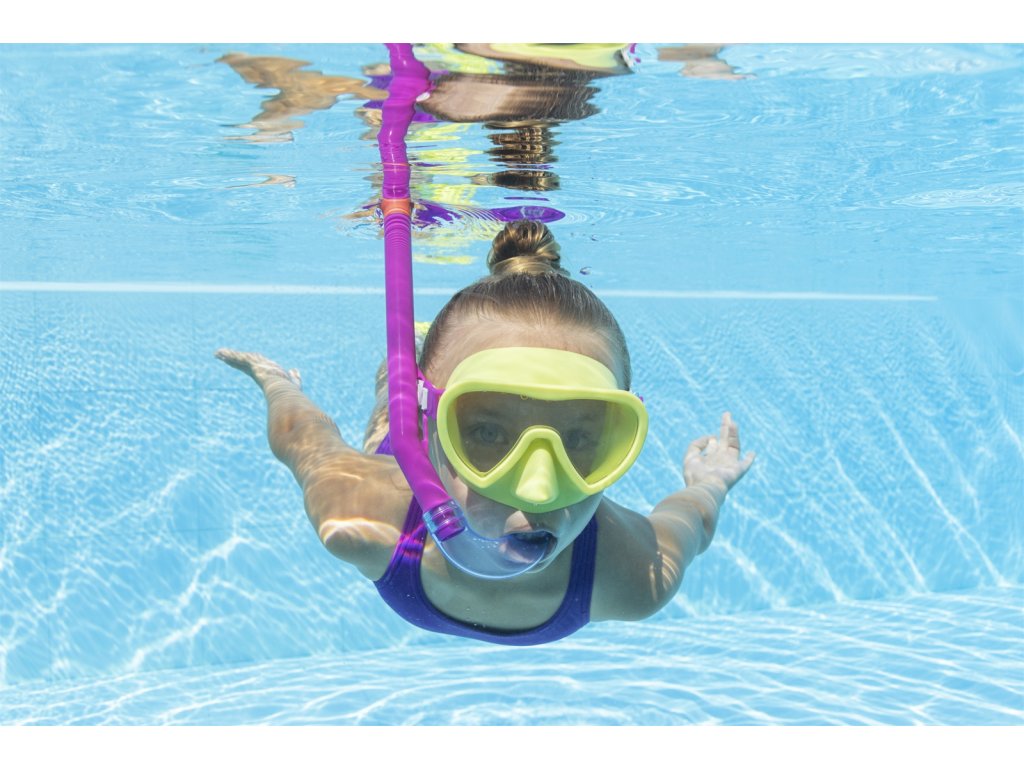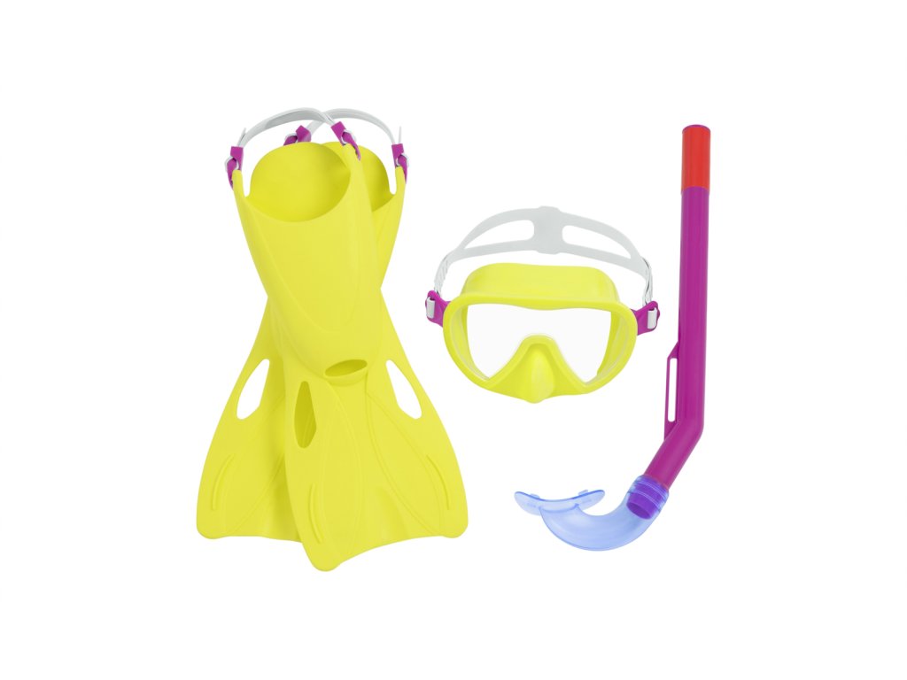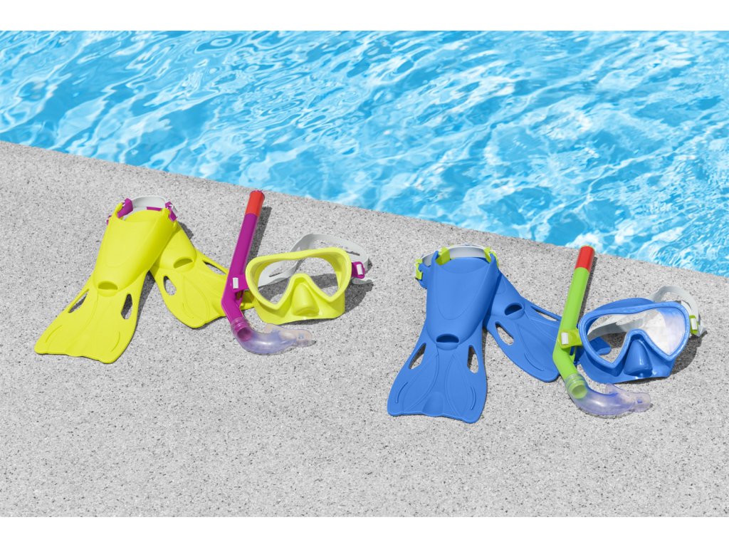 Bestway šnorchlovací set Essential – ploutve, brýle, šnorchl. Brýle mají bezpečnostní čočky s ochranným povrchem chránícím proti UV záření. Měkký lem bránící vnikání vody. Plně nastavitelný pásek na hlavu. Šnorchl má tvarově přizpůsobivý náustek. Ploutve s nastavitelným patním páskem jsou ve velikostech: EUR (24-27), USA (8-10). 100 % bez latexu. 2 barevné provedení - žluto-růžová, modro-zelená Obsahuje: 1 brýle, 1 šnorchl, 1 ploutve. Věk: 3+
