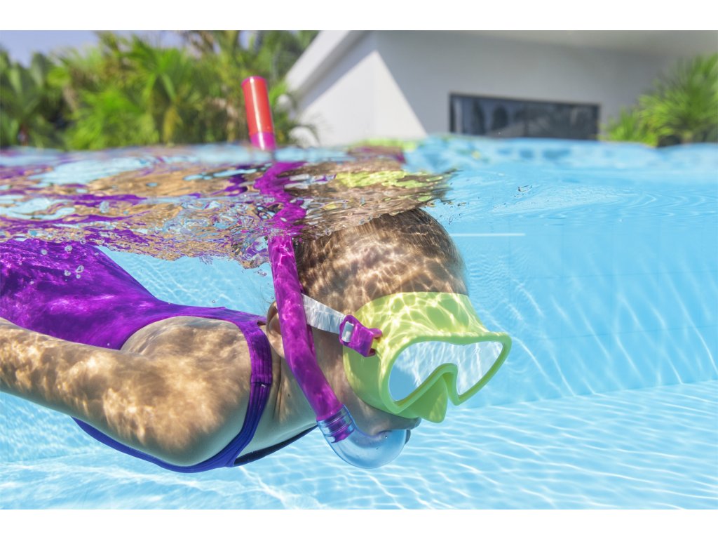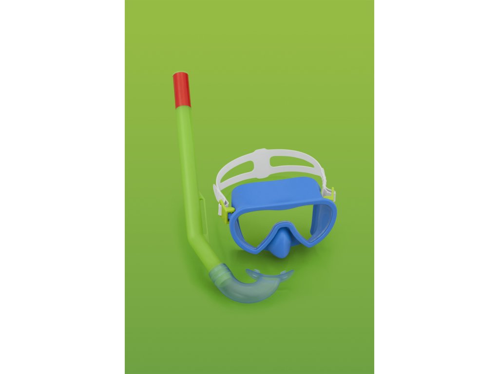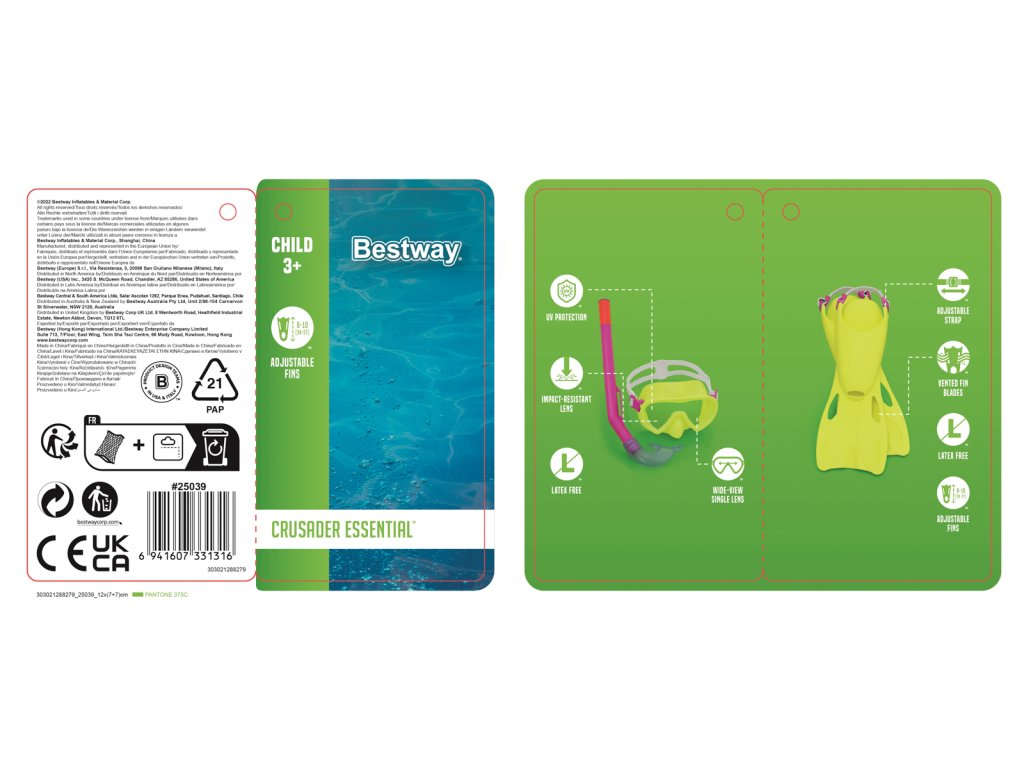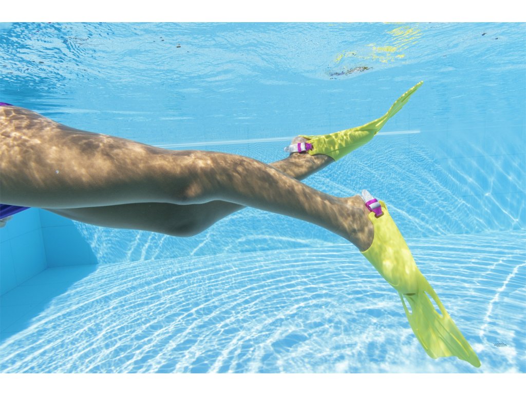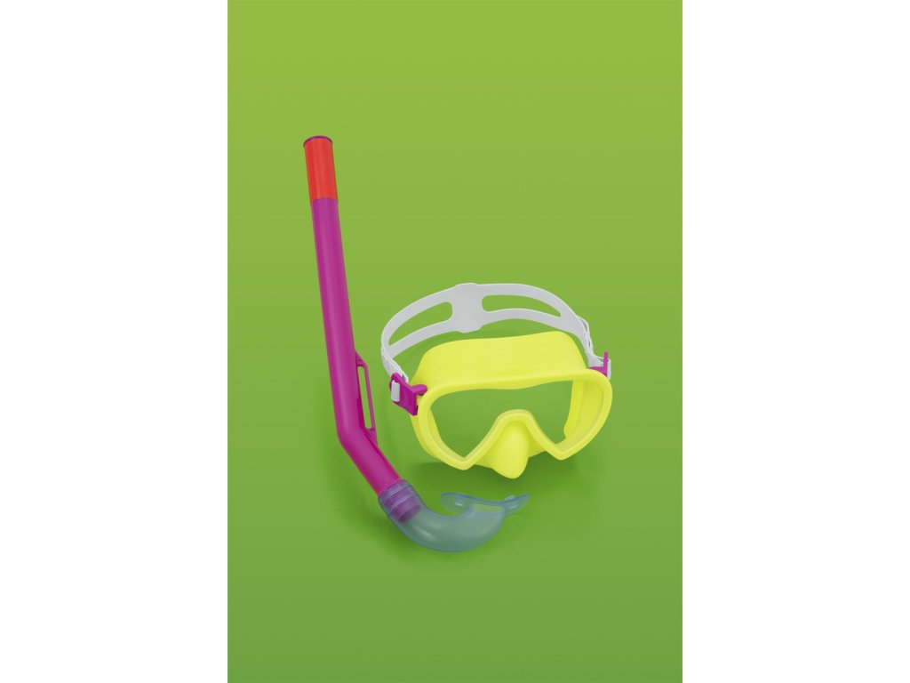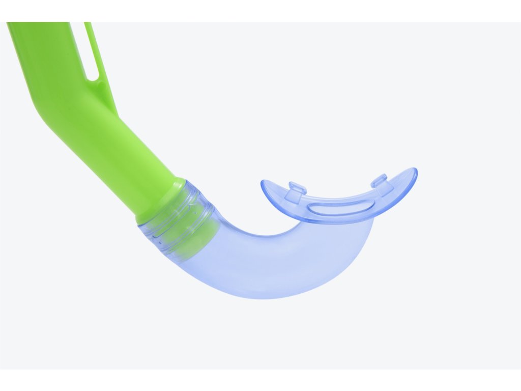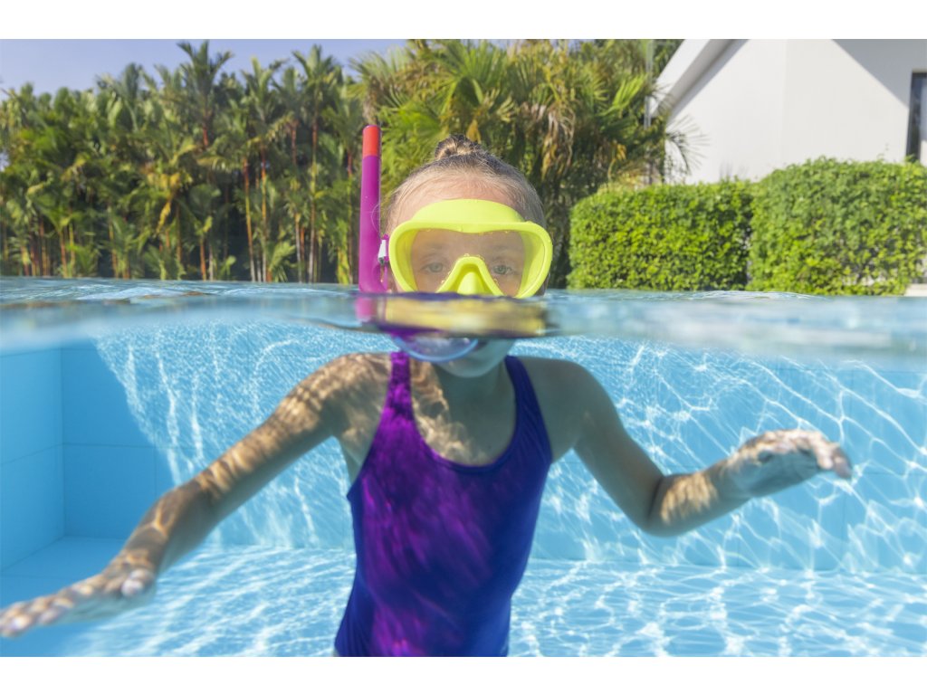 Bestway šnorchlovací set Essential – ploutve, brýle, šnorchl. Brýle mají bezpečnostní čočky s ochranným povrchem chránícím proti UV záření. Měkký lem bránící vnikání vody. Plně nastavitelný pásek na hlavu. Šnorchl má tvarově přizpůsobivý náustek. Ploutve s nastavitelným patním páskem jsou ve velikostech: EUR (24-27), USA (8-10). 100 % bez latexu. 2 barevné provedení - žluto-růžová, modro-zelená Obsahuje: 1 brýle, 1 šnorchl, 1 ploutve. Věk: 3+