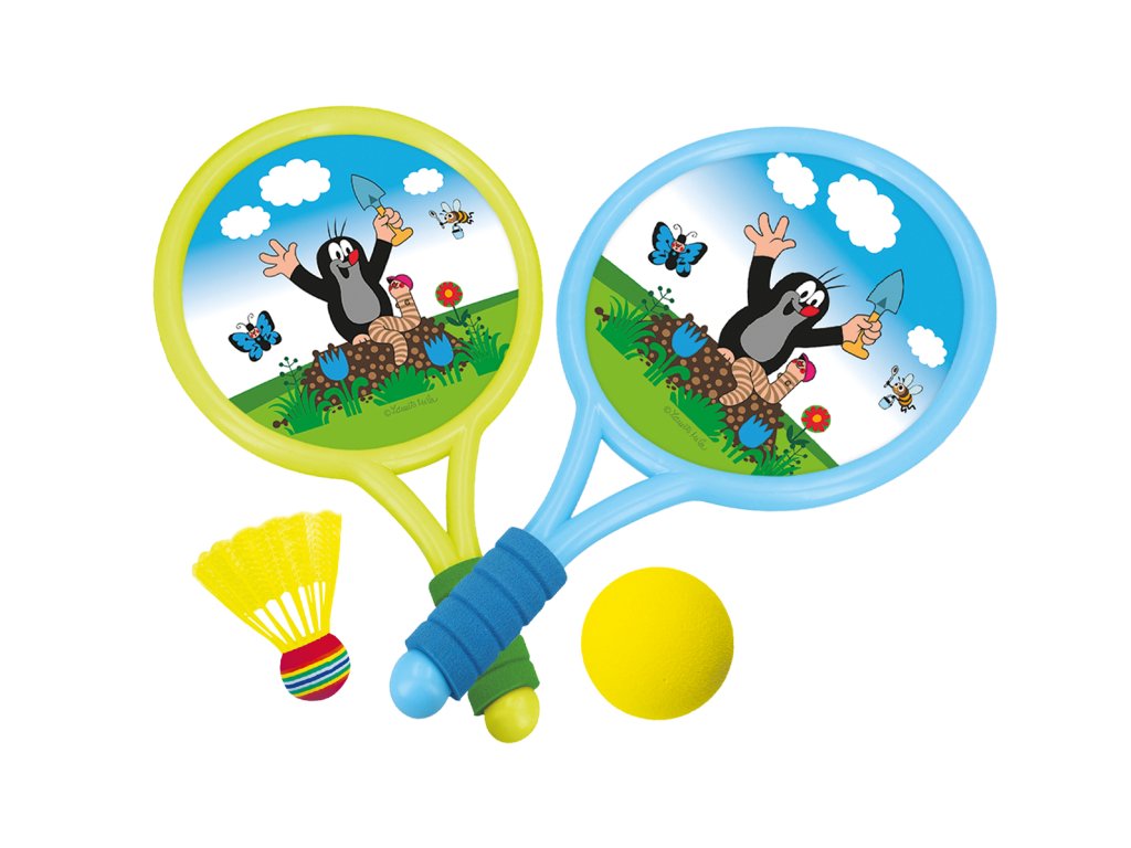 Tenis Krtek. Součástí 2 rakety, míček, košík na badminton.