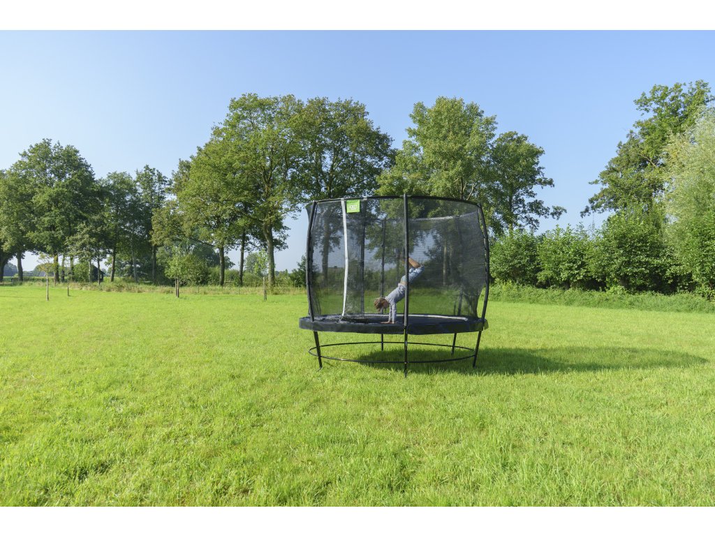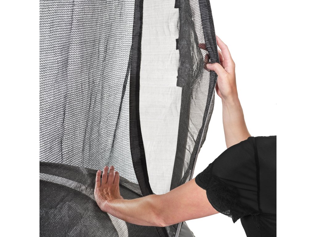 Ochranná síť má bezpečnostní tunelový vchod, tak je je u vyšších řad trampolín Exit zvykem. Nyní je doplněn ještě o designový barvený pruh, který dodává trampolíně moderní vzhled. Tyče pro držení ochranné sítě o průměru 25mm jsou chráněny pěnou zatavenou v plastovém obalu. Horní část ochranné sítě je držena pomocí laminátového prutu. Síť je přichycena a našponována na tyče držící ochranou síť pro maximální využití prostoru uvnitř trampolíny. I přesto, že je síť vnější tak je zachována bezpečnostní ochrana proti pružinám pomocí FPS systému to znamená, že výhody vnitřní sítě jsou zachovány a díky vnější síti je možno využít více prostoru v trampolíně.