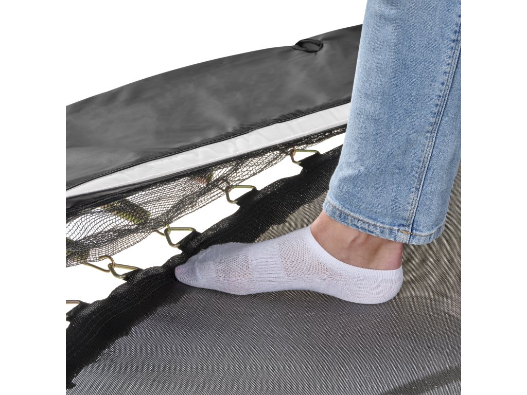 Balení neobsahuje žebřík, doporučujeme dokoupit žebřík Exit, který rozměry pasuje přesně na trampolínu a do otvorů v ochranném límci pružin.