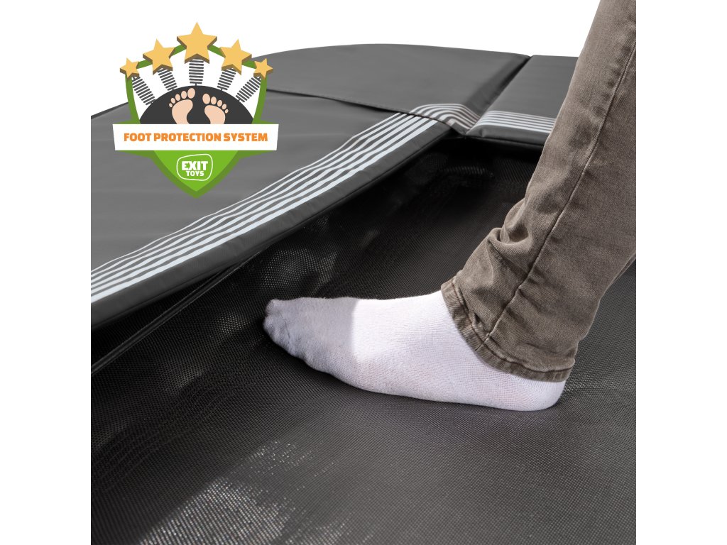 U Exit Toys je bezpečnost klíčová. Elastické popruhy se postarají o to, že po každém odrazu se polstrování automaticky stáhne zpět do správné polohy. Díky tomu zůstávají pružiny vždy bezpečně zakryté a kryt pružin vždy úhledně na svém místě. Kromě toho je skákací plachta vybavena speciálně pro Exit Toys navrženým systémem ochrany nohou (FPS), takže se Vám nikdy nemůže stát, že se vám noha při skákání zasekne mezi pružiny. Abyste si užili roky bezstarostného skákání, rám zapuštěné trampolíny je pozinkovaný a práškově lakovaný, takže rez nemá šanci a je odolná vůči všem povětrnostním vlivům. Trampolína je také 100% opravitelná, což znamená, že každý díl lze vyměnit.