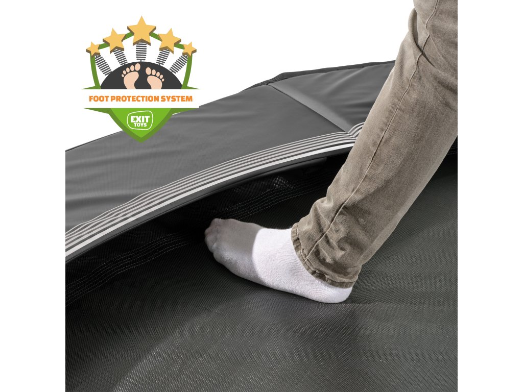U Exit Toys je bezpečnost klíčová. Elastické popruhy se postarají o to, že po každém odrazu se polstrování automaticky stáhne zpět do správné polohy. Díky tomu zůstávají pružiny vždy bezpečně zakryté a kryt pružin vždy úhledně na svém místě. Kromě toho je skákací plachta vybavena speciálně pro Exit Toys navrženým systémem ochrany nohou (FPS), takže se Vám nikdy nemůže stát, že se vám noha při skákání zasekne mezi pružiny. Abyste si užili roky bezstarostného skákání, rám zapuštěné trampolíny je pozinkovaný a práškově lakovaný, takže rez nemá šanci a je odolná vůči všem povětrnostním vlivům. Trampolína je také 100% opravitelná, což znamená, že každý díl lze vyměnit.