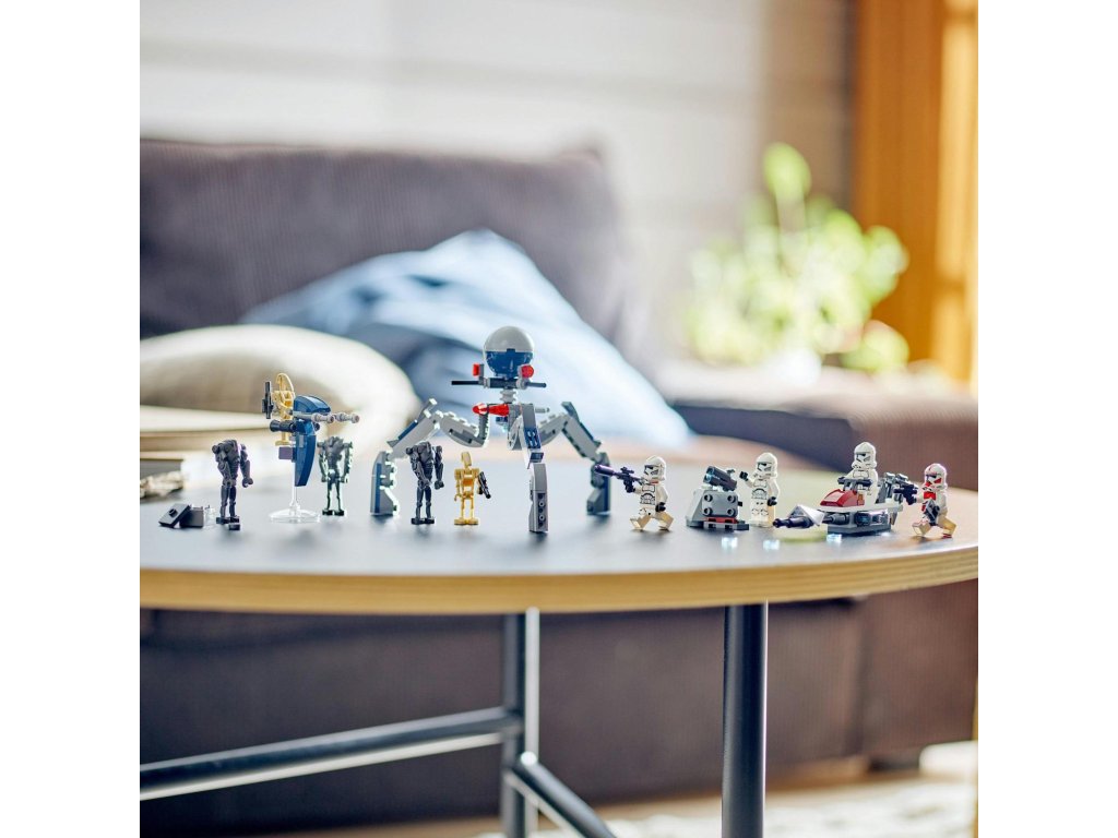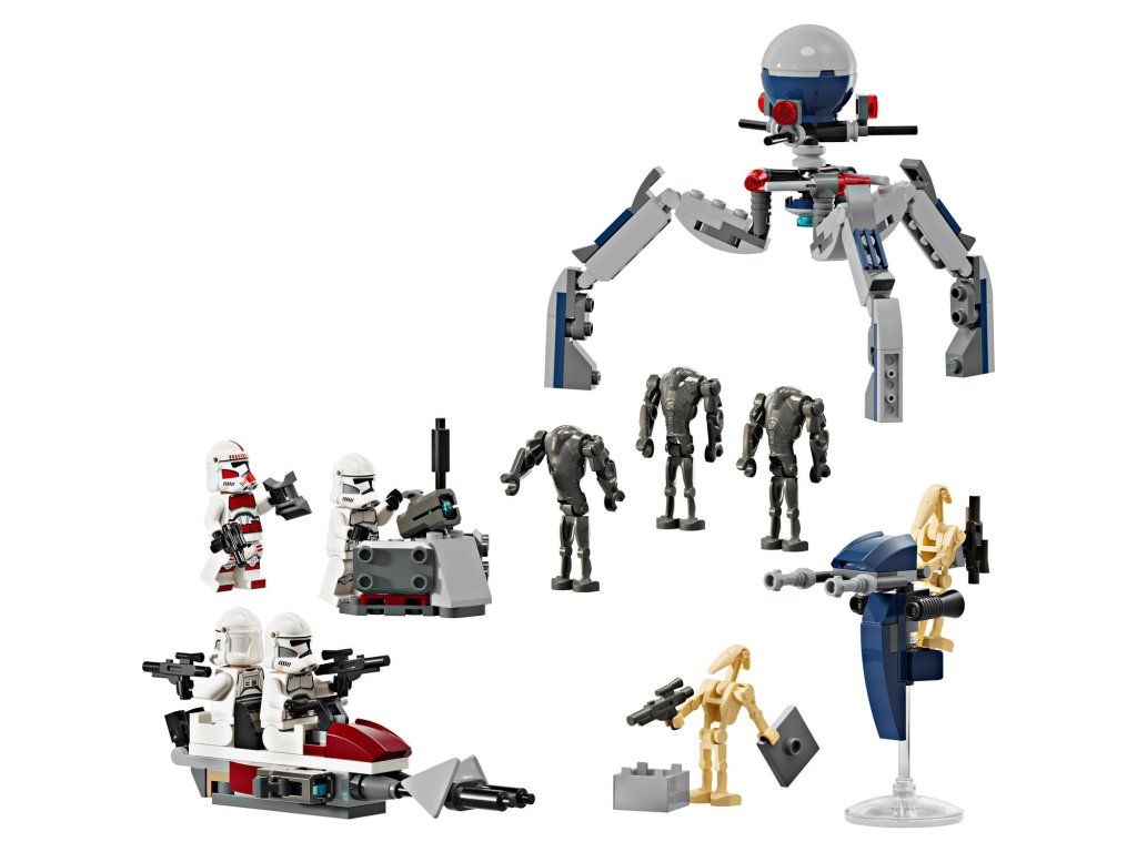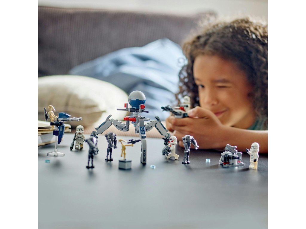 Inspirujte děti od 7 let k přetvoření strhujících scén ze seriálu Star Wars: Klonové války se sadou LEGO® Star Wars™ (75372) Bitevní balíček klonového vojáka a bitevního droida. Součástí jsou 4 minifigurky LEGO Star Wars a 5 figurek LEGO – klonový šokový voják, 3 klonovaní vojáci, 3 super bitevní droidi a 2 bitevní droidi – s typickými zbraněmi pro akční hraní. Součástí této stavebnice LEGO je také spídrová motorka Star Wars s vystřelovači pro 2 klonované vojáky a sestavitelné vozidlo STAP spídr pro bitevního droida. Další porci kreativních herních možností přináší také tri-droid se 3 vystřelovači a obranné stanoviště s vystřelovačem.