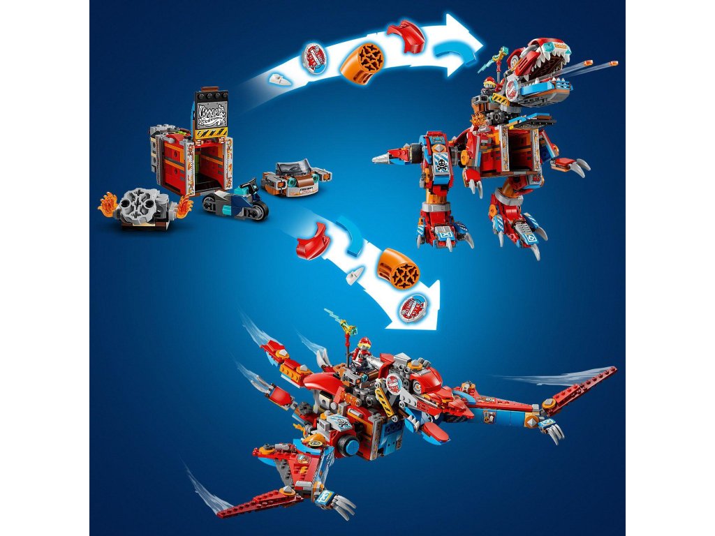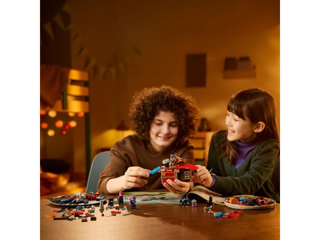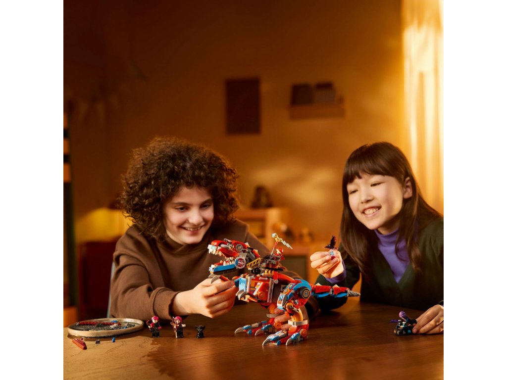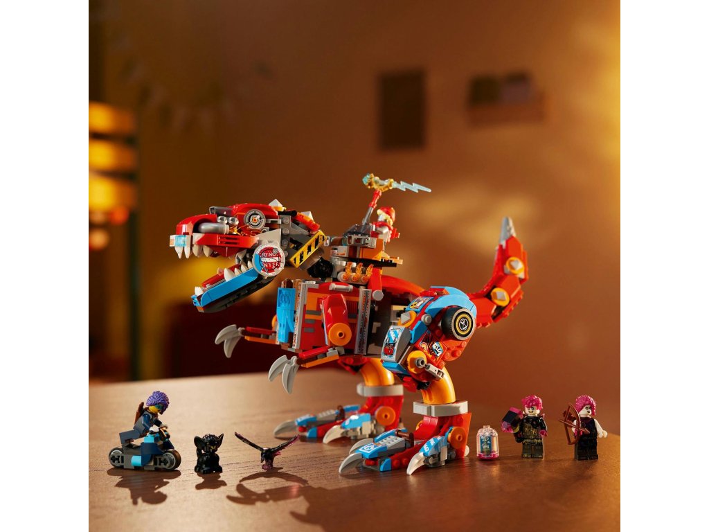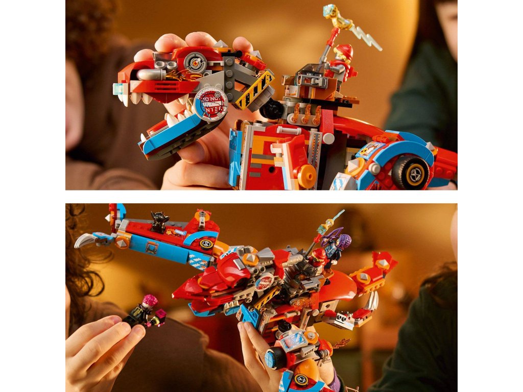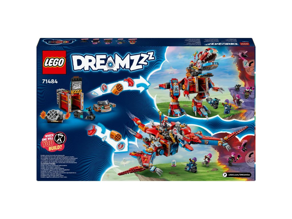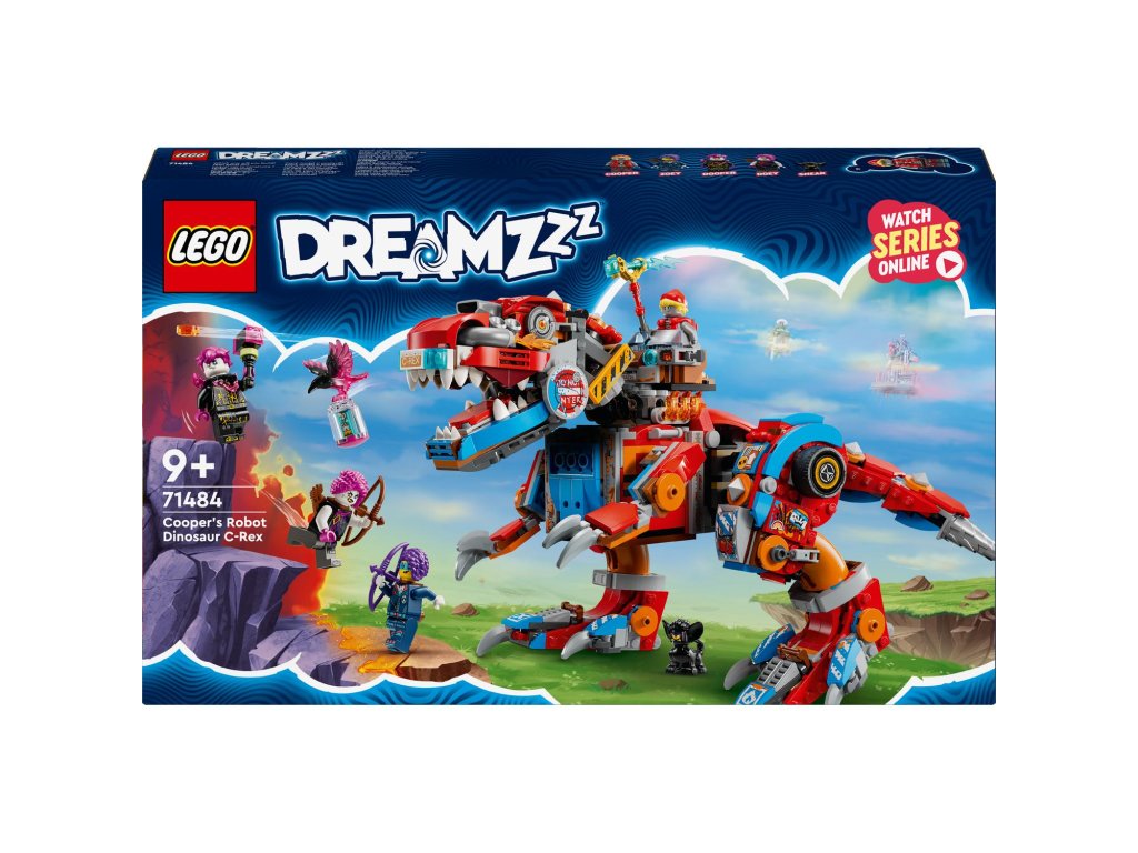 Popusťte uzdu fantazii se stavebnicí LEGO® DREAMZzz™ (71484) Cooperův robotický dinosaurus C-Rex pro děti od 9 let, kterou lze sestavit jako dinosaura T-rexe. Stavebnice na motivy napínavého televizního seriálu dětem přináší hned 2 způsoby sestavení parádního modelu dinosaura. Padouši z nočních můr ukradli Sandmanovu věž a uvěznili ji ve sklenici snů! Zoey a Cooper ji musí získat zpět. Děti jim pomůžou tak, že promění Cooperovo vrakoviště z kostek LEGO v akční figurku T-rexe nebo pterodaktyla. S modely si děti užijí hodiny nápaditého hraní a oba dinosauři mají pohyblivou hlavu, cvakající čelisti, nebezpečný ocas a dvojité vystřelovače. Zoey a Cooper, jejich temní dvojníci Doey a Dooper a figurka Sneaka přivádějí kreativní hračku k životu. Zoey má luk a Cooper kladivo a oba hrdiny lze posadit do auta na zádech dinosaura. Součástí kreativní hračky je také návod na stavění vedený příběhem, který nastartuje představivost dětí a inspiruj je, aby se ponořily do akce. Rozměry – Stavebnice se skládá z 917 dílků a model T-rexe měří přes 18 cm na výšku