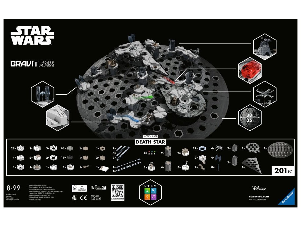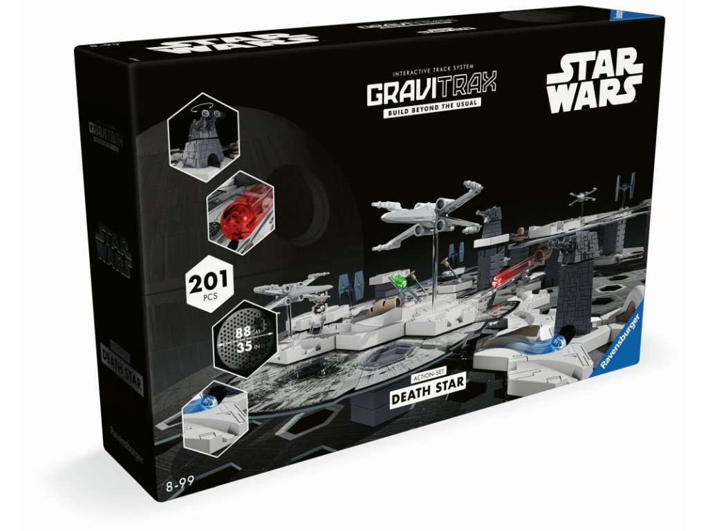 Ponořte se do fascinující galaxie Star Wars s prvky speciálně upravenými do podoby Star Wars. Výškové desky ve tvaru legendárních vesmírných lodí, zakřivené kostky s charakteristickými strukturami Hvězdy smrti a mnoho akčních prvků v nových barvách dělají z dráhy GraviTrax epické dobrodružství.