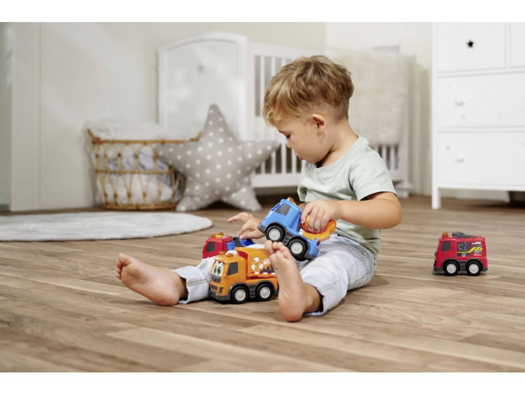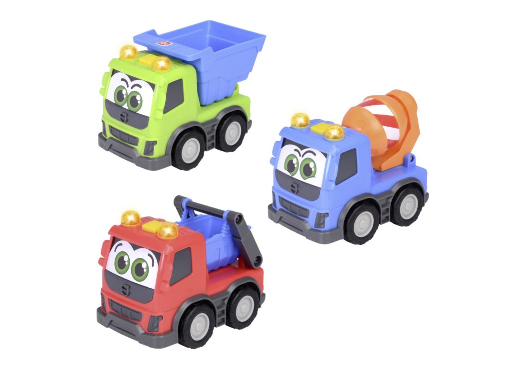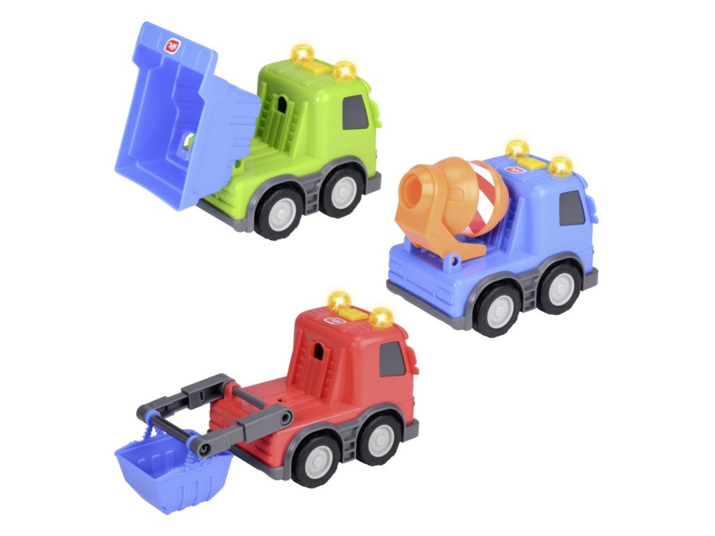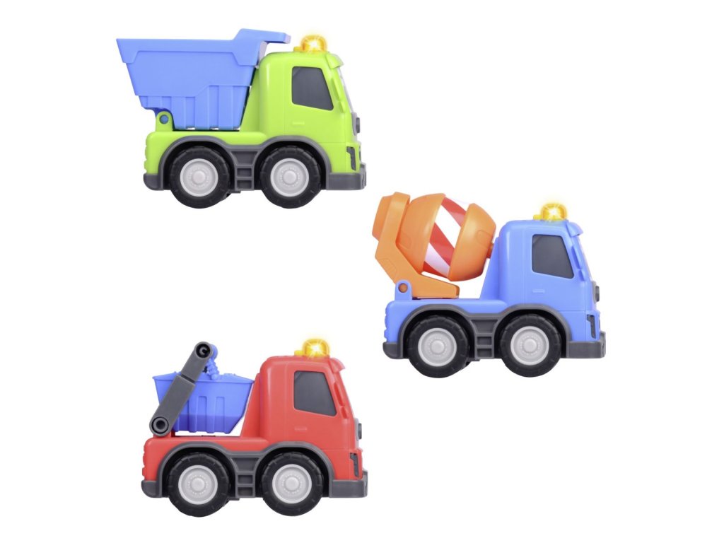 Veselé pracovní autíčko pro nejmenší, na volnoběh. Namalovaná očíčka, zvukový a světelný efekt. 3 druhy - sklápěčka, míchačka, nákladní auto. Délka 13 cm.