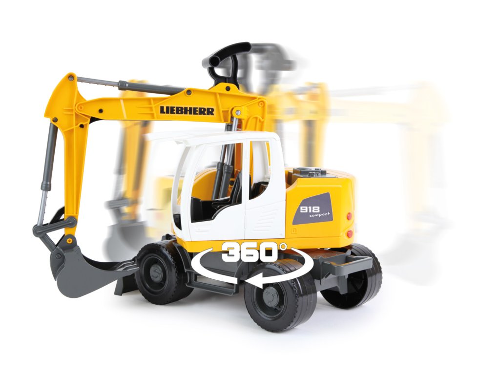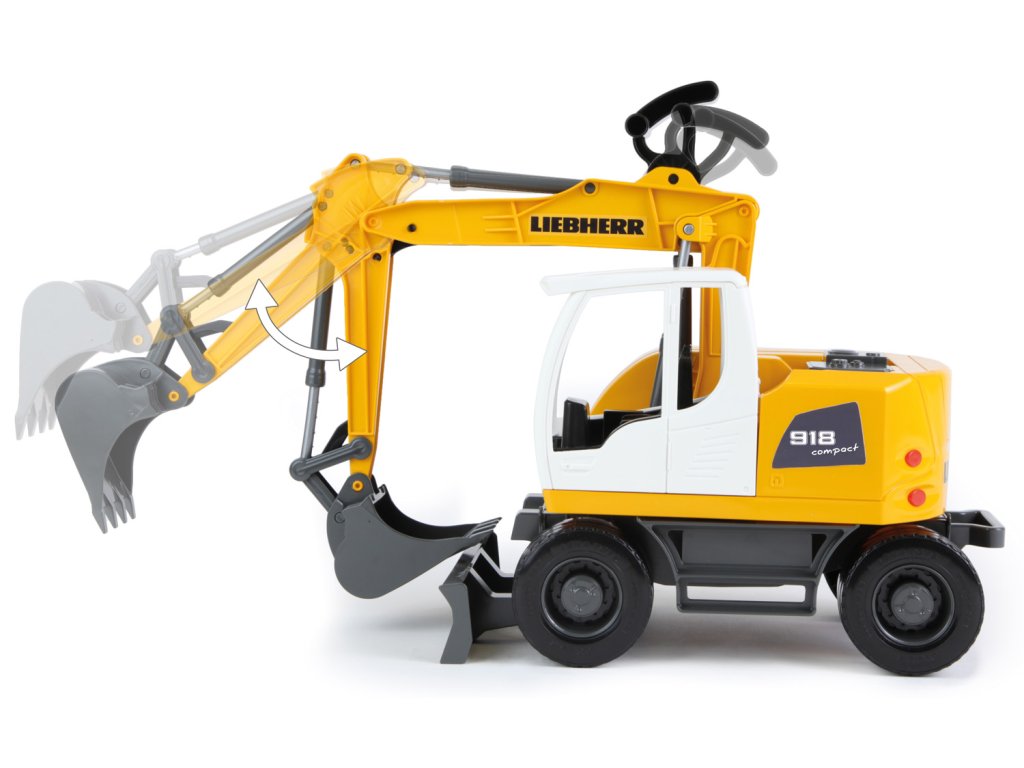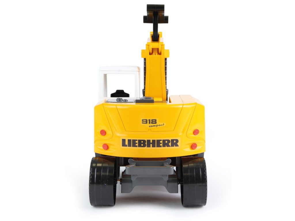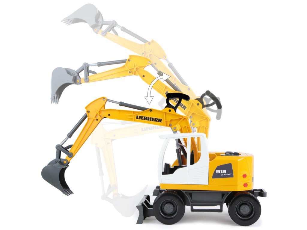 Bagr Liebherr A 918 Litronic. 6mm tlusté kovové osky u kol. Horní otočná část o 360° s možností aretace. Rameno bagru lze natáhnout 55cm. Pohyblivá přítlačná radlice.