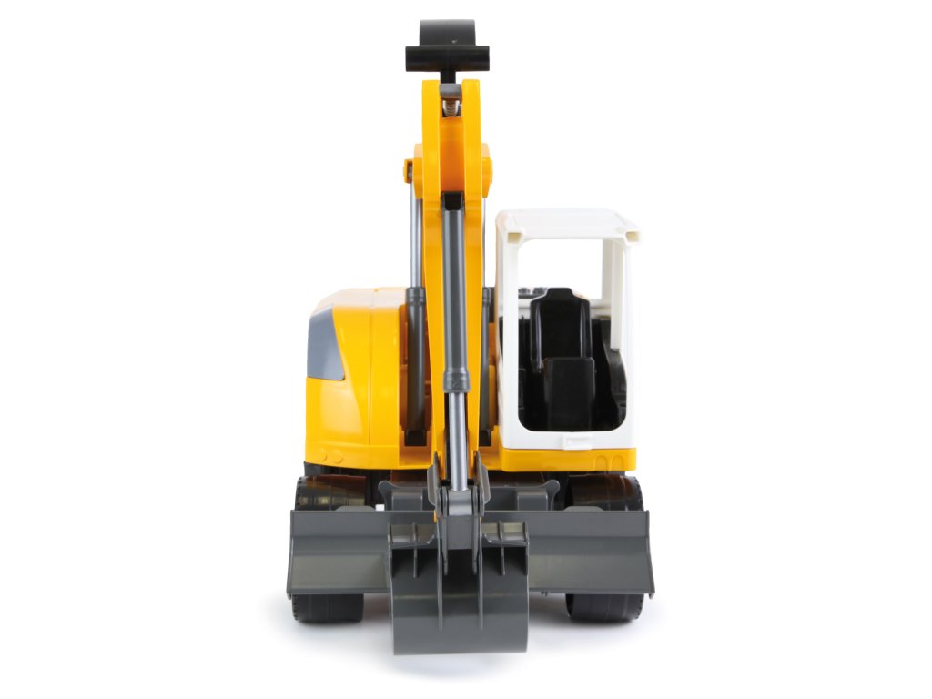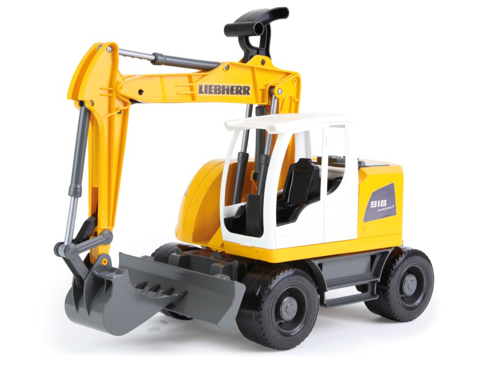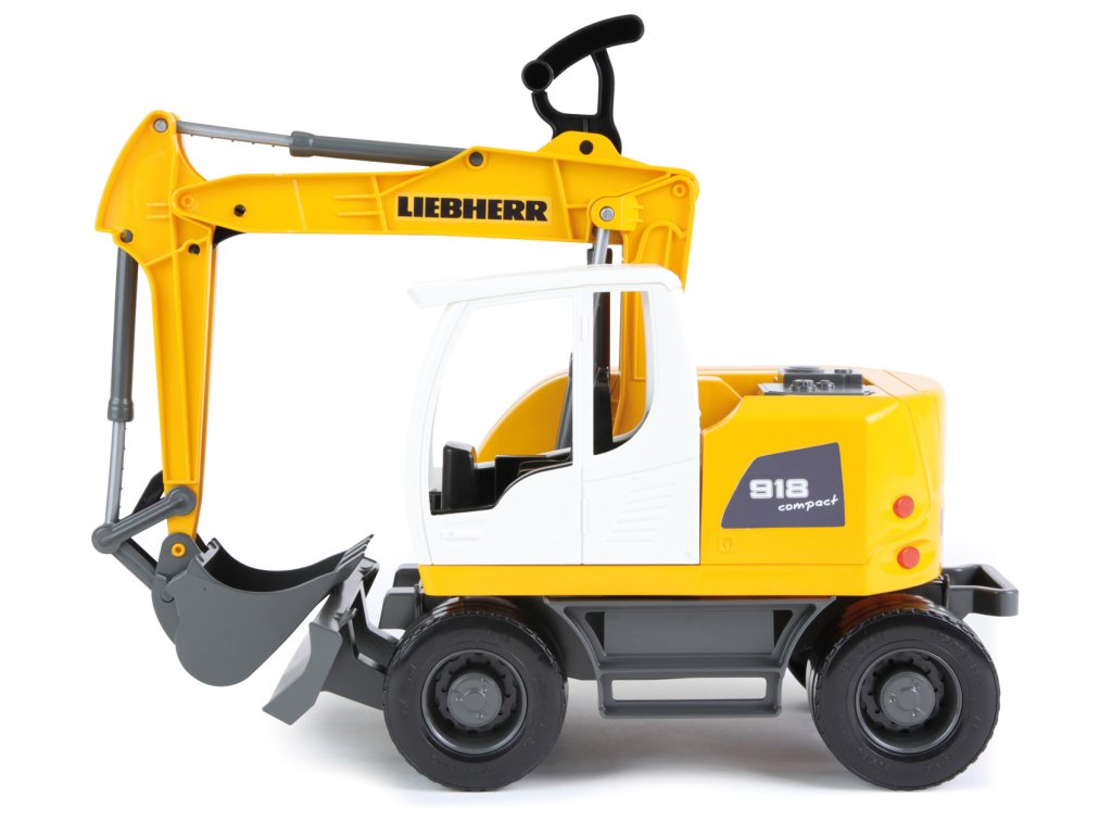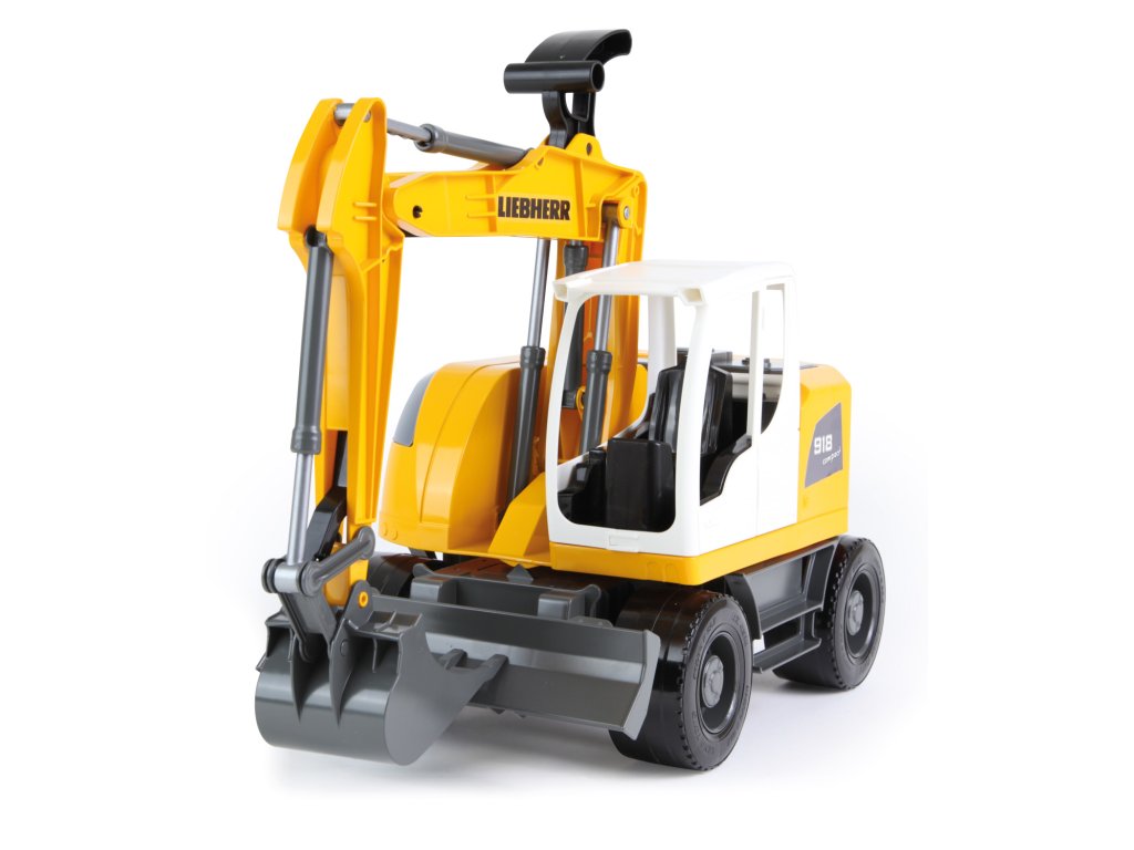 Bagr Liebherr A 918 Litronic. 6mm tlusté kovové osky u kol. Horní otočná část o 360° s možností aretace. Rameno bagru lze natáhnout 55cm. Pohyblivá přítlačná radlice.