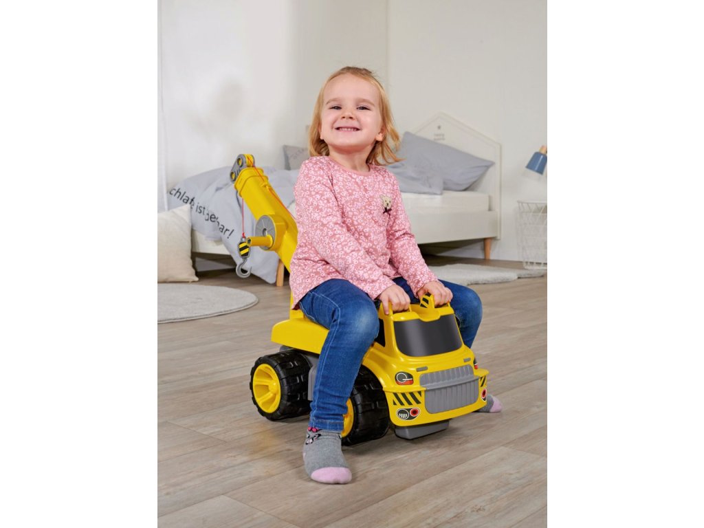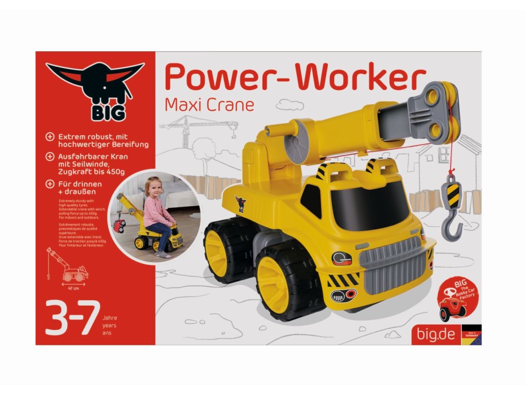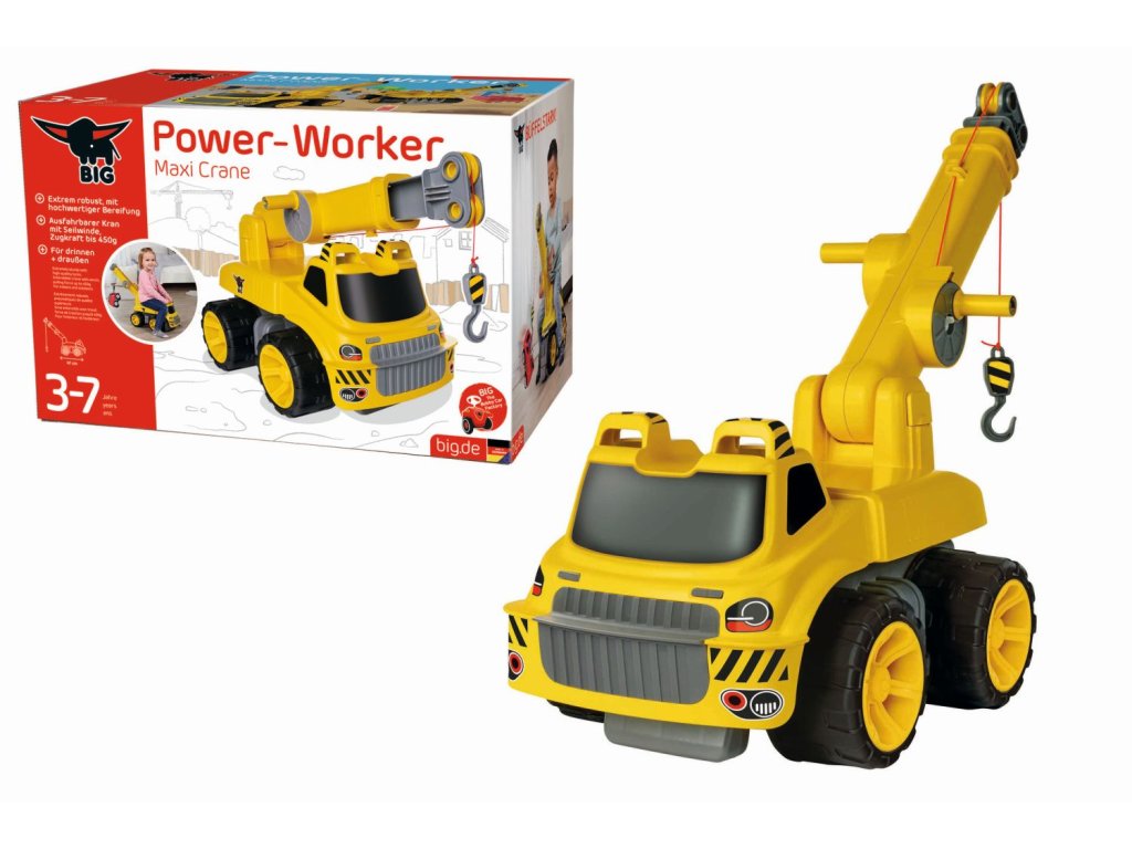 Velký jeřáb z kvalitního, robustního plastu, otočný o 360 stupňů, s pohyblivým ramenem. Hlavním rysem je extrémně pevný lanový naviják, se kterým lze bez problémů vytáhnout předměty s tažnou silou až 450g. Lanový naviják je součástí snadno použitelného ramena jeřábu, které lze složit a otáčet 360° kolem vlastní osy. Přední a zadní ochrana proti převrácení zajišťuje potřebnou bezpečnost. Se dvěma madly na kabině řidiče lze zaručit pohodlný styl jízdy. Kovové nápravy a kvalitní pneumatiky vyrobené z měkkého plastu nezanechávají stopy a zaručují také nejlepší jízdní vlastnosti. Maxi jeřáb BIG Power Worker je ideální pro malá staveniště na hřišti, na zahradě i v dětském pokoji. Vyrábí se v moderní továrně BIG v Německu a byl testován na maximální bezpečnost. Max. nosnost 50 kg. Rozměry: 51 x 30 x 33 cm. Váha 3,5 kg.