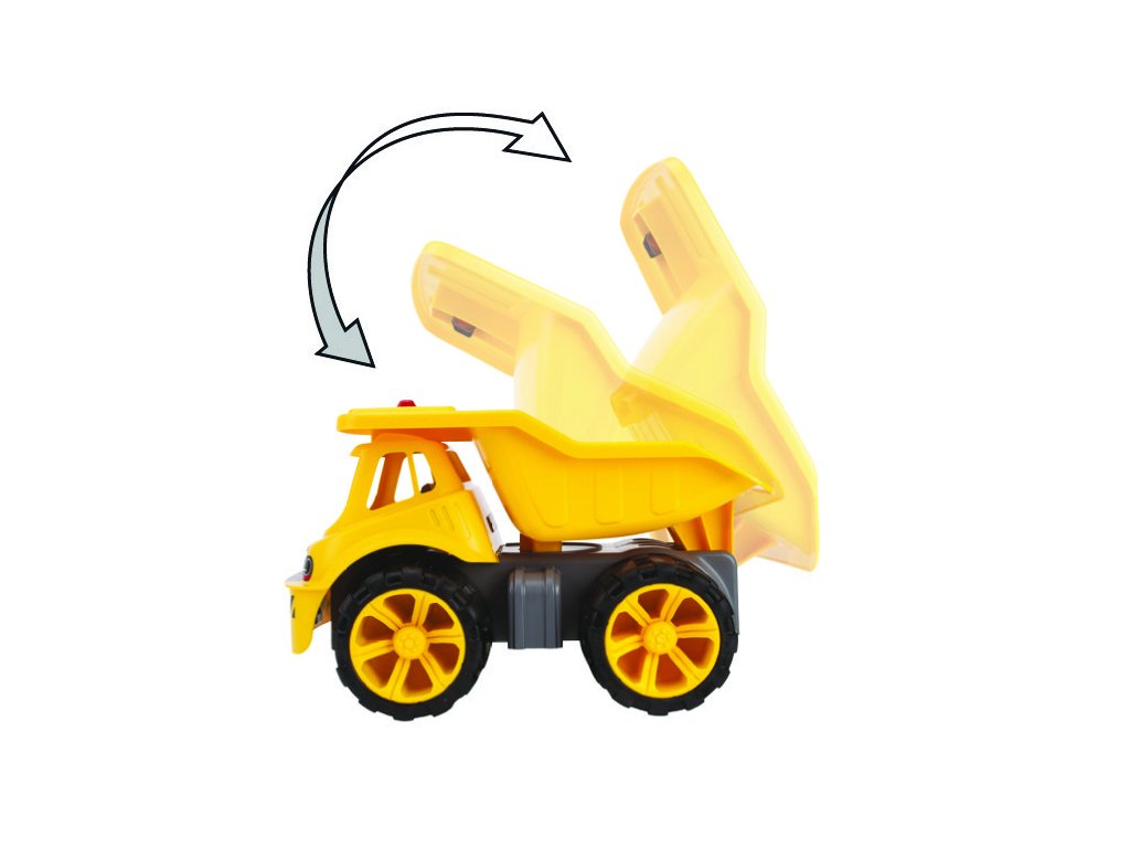 Velká sklápěčka z kvalitního plastu. Korbu lze zajistit proti samovolnému vyklopení. Pneumatiky z materiálu, který nezanechává stopy na podlaze. Délka 46 cm.