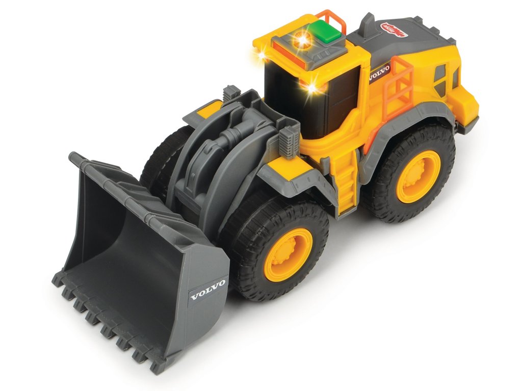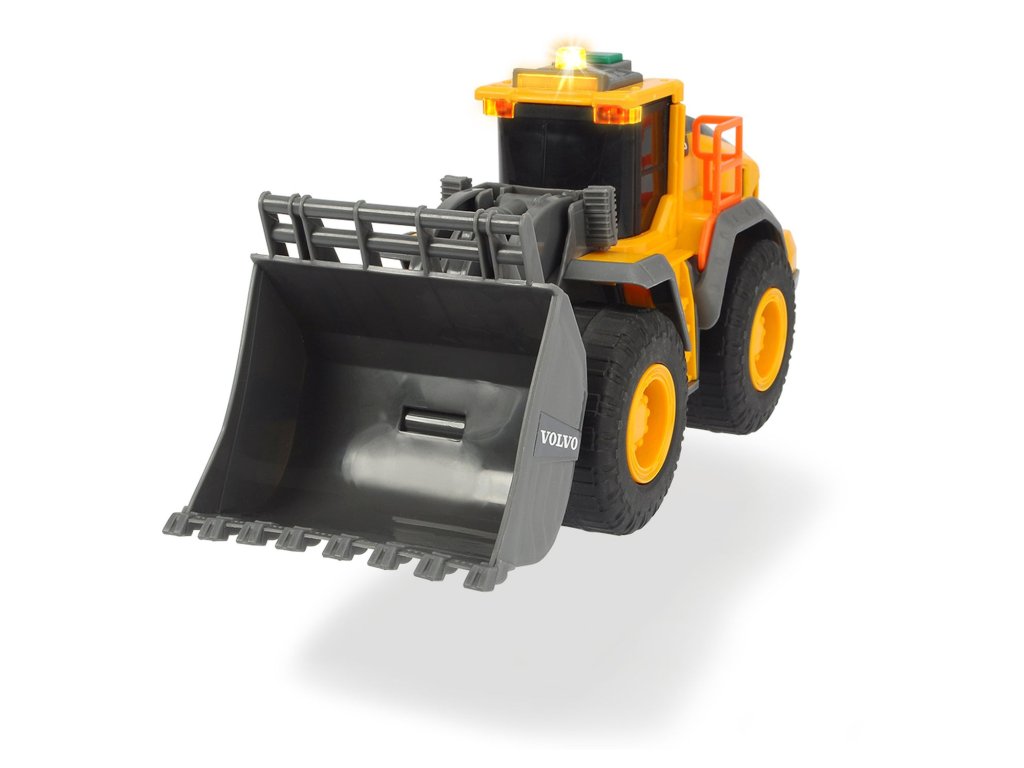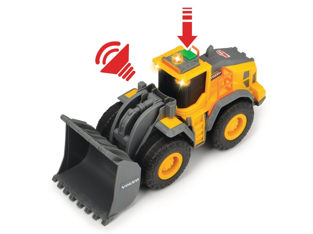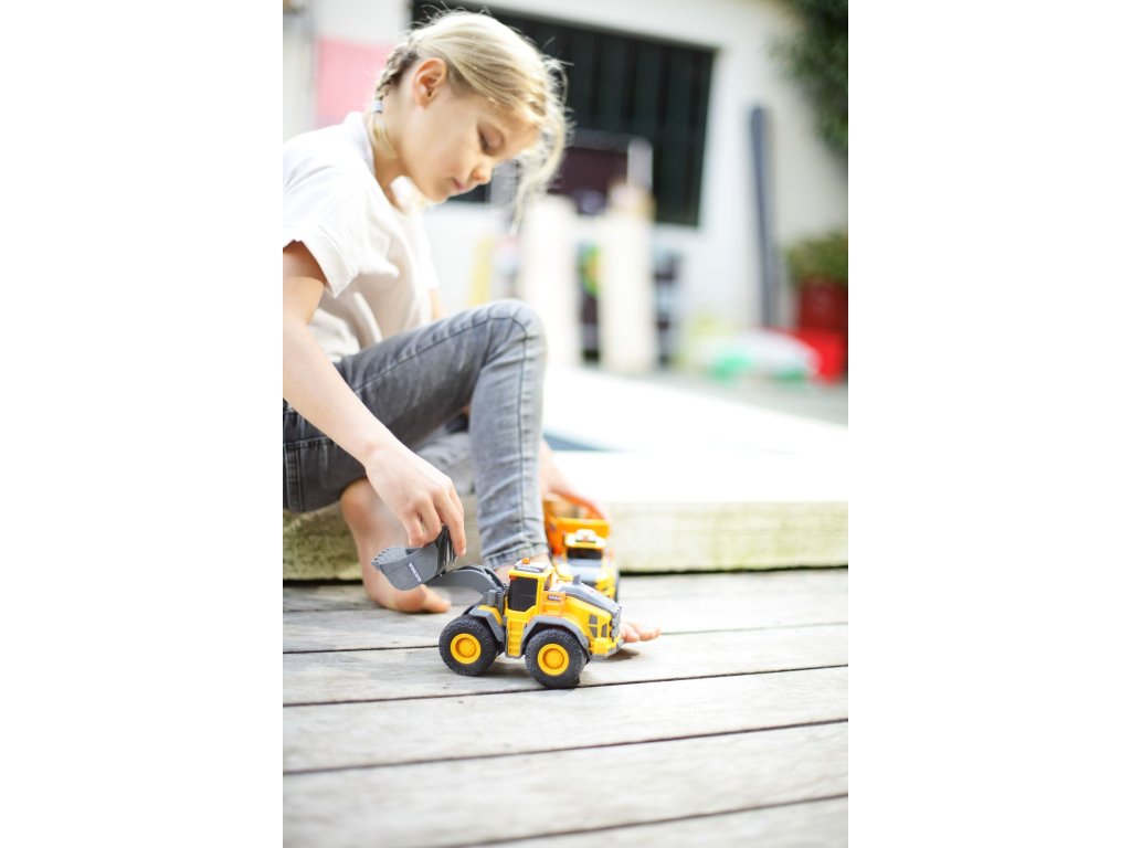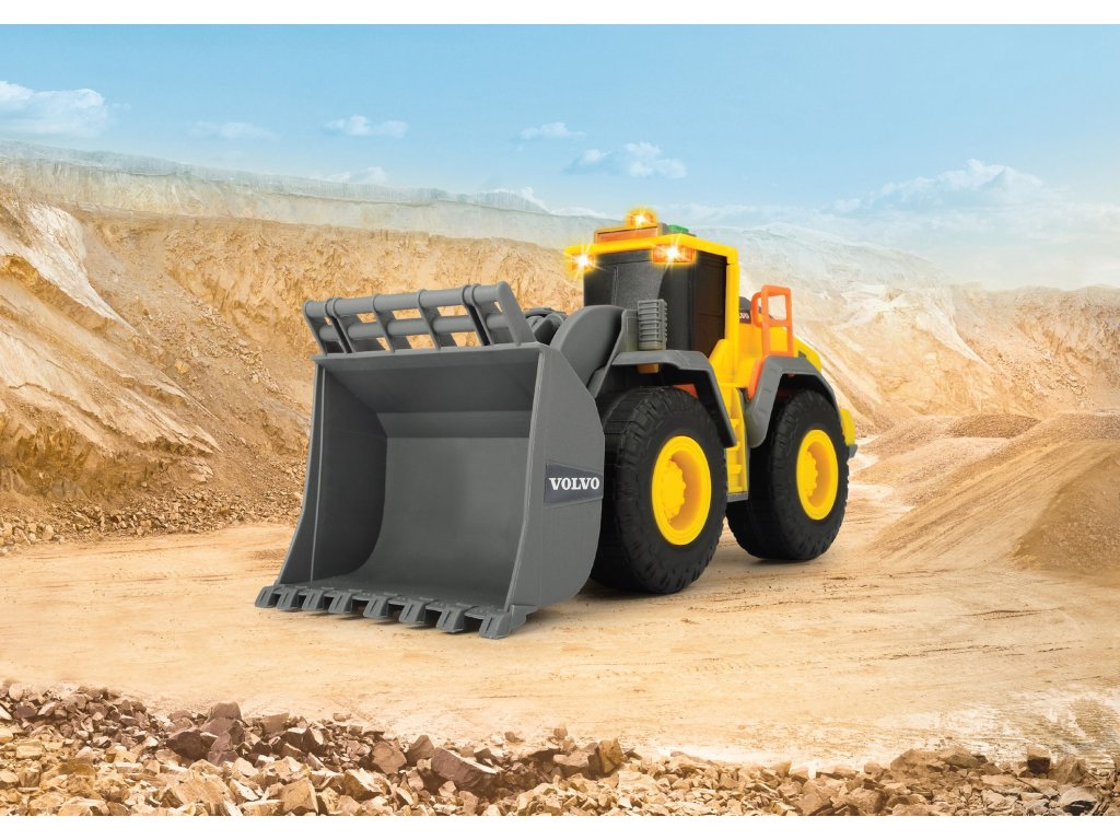 Stavební kolový nakladač v licenci Volvo na volnoběh, se světelnými a zvukovými efekty, manuálně pohyblivá radlice. Délka 23 cm.