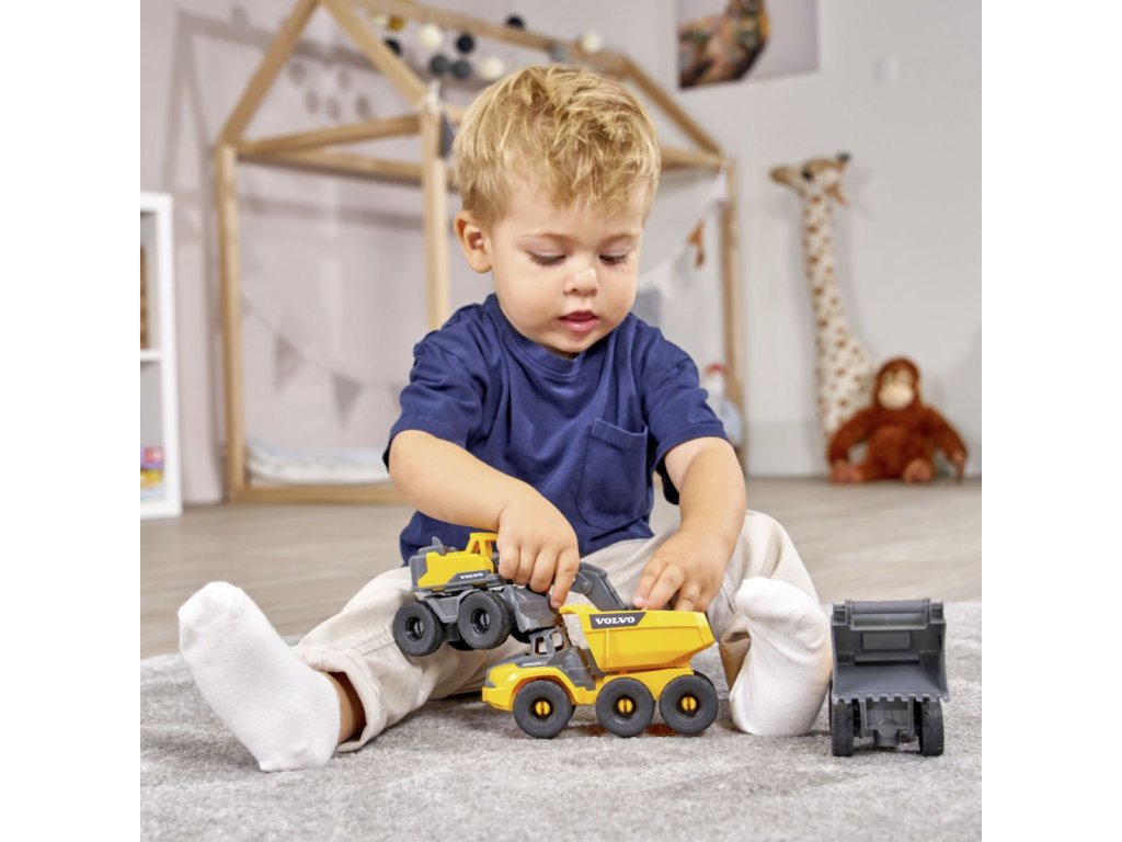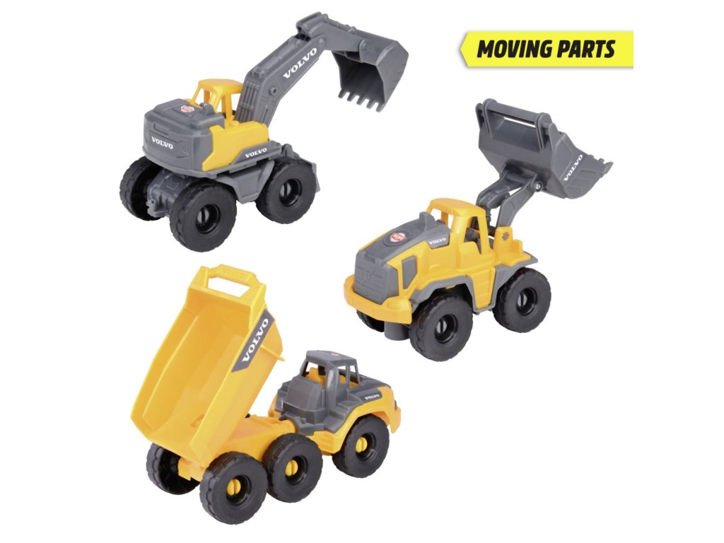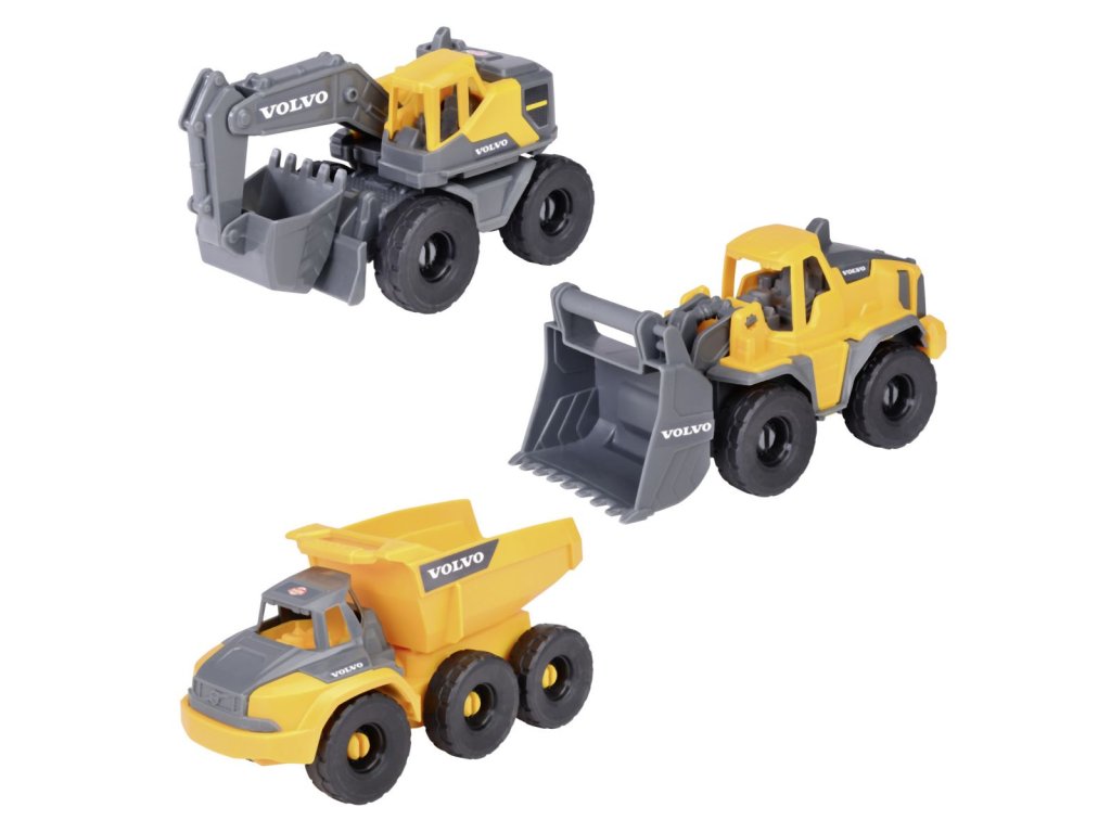 Set 3 ks stavebních aut - kolový nakladač, bagr, kloubové nákladní auto . Na volnoběh, pohyblivé části, barva šedá/žlutá. V měřítku 1:36. Délka autíčka 16 cm.
