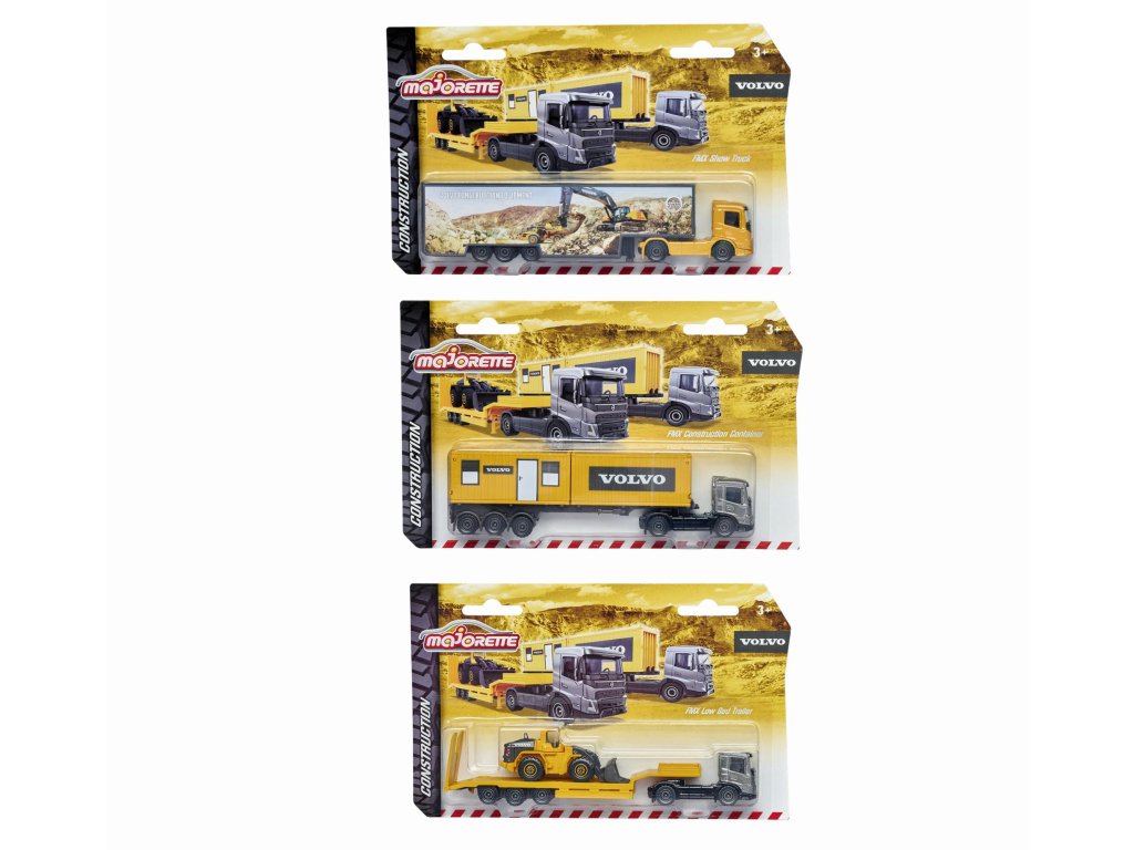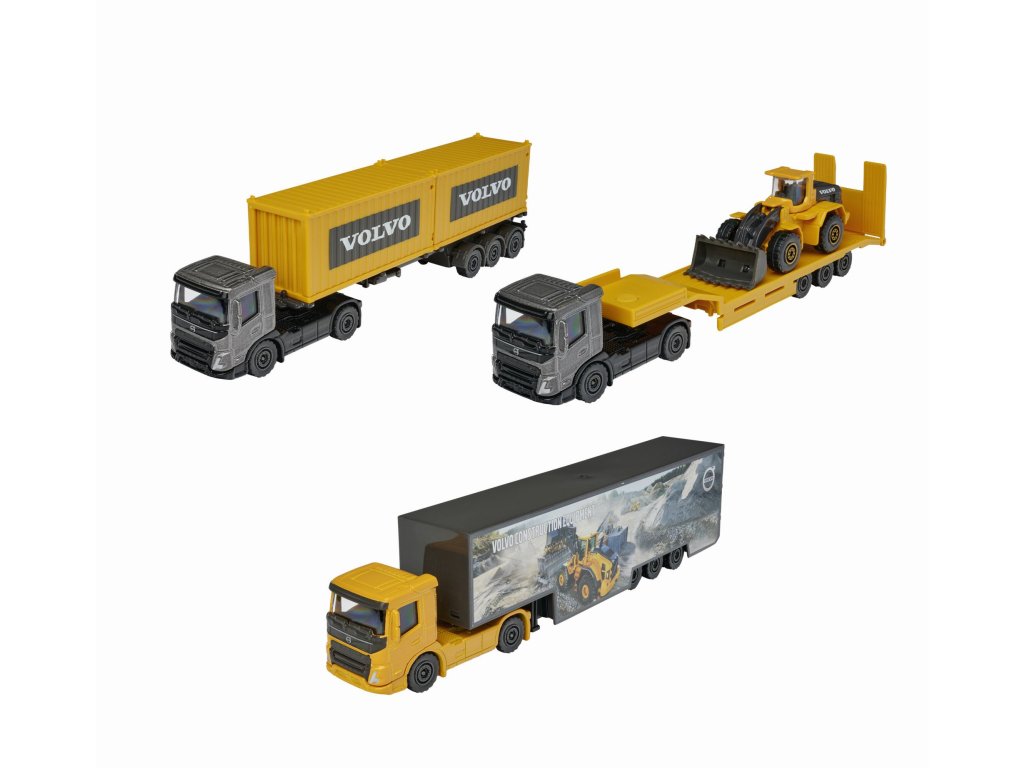 Kovový nákladní automobil Volvo – Transportér s přívěsem a kolovým nakladačem, se 2 stavebními kontejnery nebo kamion s odpojitelným přívěsem. Díky robustnímu kovovému podvozku a vysoce kvalitnímu provedení je každé vozidlo vyrobeno tak, aby vydrželo. Délka 20 cm.