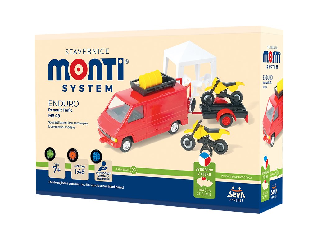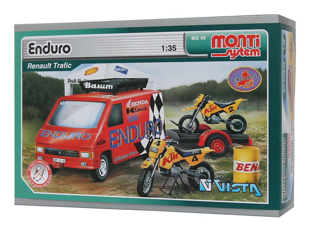 Model Renault Trafic MS 49 Enduro v měřítku 1:35 pro závody motorek. Motocykly táhnete na vozíku, uvnitř vozu je zbytek vybavení. Stavebnice patří do skupiny Basic.