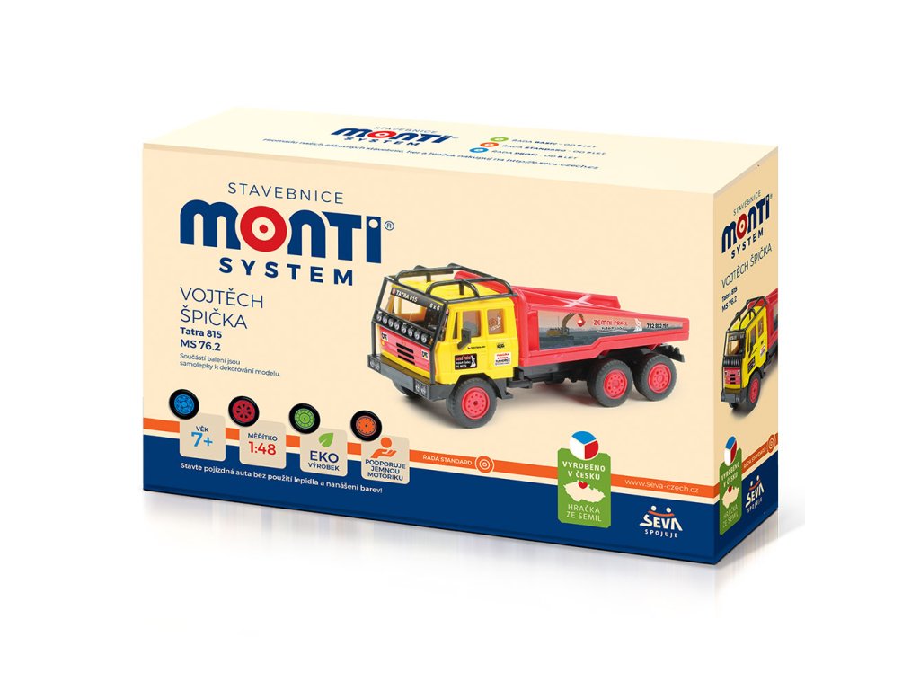 Monti System je legendární česká stavebnice věrných modelů osobních a nákladních aut, s kterými si vyhrají malí i velcí. Modely jsou vyráběny v měřítku 1:48, 1:35 a 1:28.Monti System sestavíte bez lepidla a nanášení barev! Tento model je inspirován skutečnou Tatrou 815 6x6, která se účastní truck trialových závodů po celé ČR. Řidičem tohoto speciálu se startovním číslem 450 je pan Vojtěch Špička a spolujezdce mu dělají pánové Jiří Urban a Ottas Wagner.