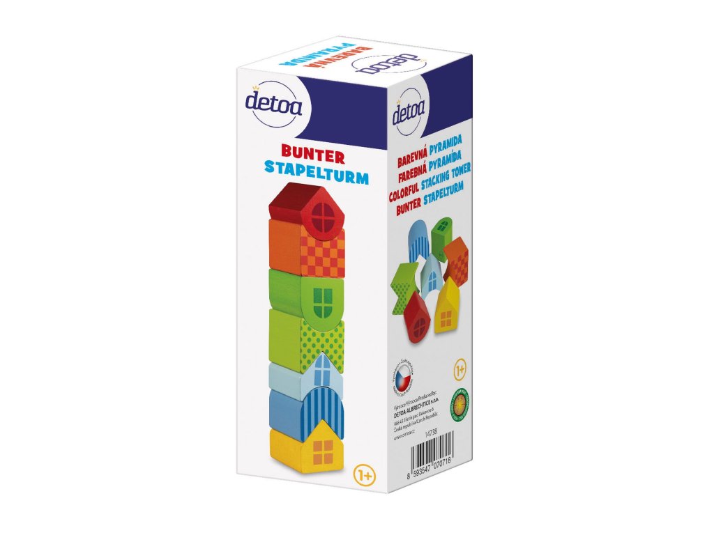 Dřevěná skládací pyramida rozvijí představivost, logické myšlení a motorické schopnosti dítěte. Výrobek splňuje požadavky EU na bezpečnost hraček a je vhodný pro děti od 1 roku. Rozměry výrobku jsou 140 x 55 mm.