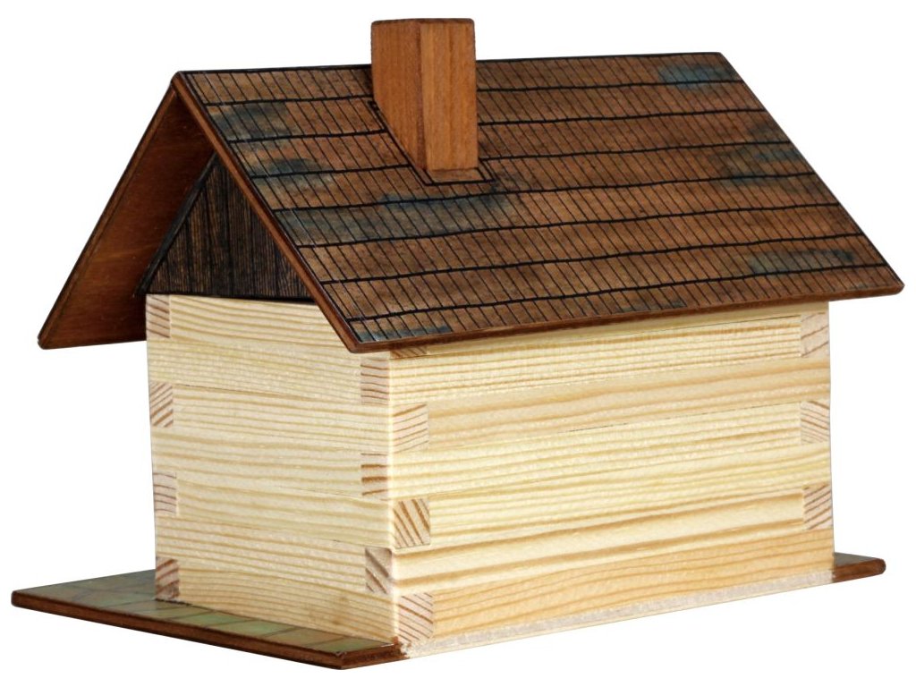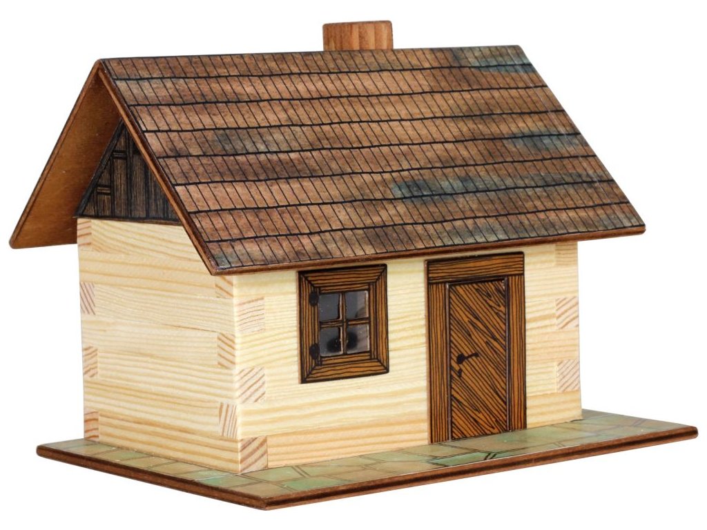 Dřevěná slepovací stavebnice Walachia - Roubená chaloupka. Slepovací stavebnice Walachia jsou dřevěné modely domečků a staveb z Valašského kraje v měřítku 1:32. Základem jsou dřevěné hranolky 9x9 mm a k tomu jsou v sadě vždy všechny papírové doplňky - okna, dveře, střešní části atd. Pro lepení se používá lepidlo Herkules, není však součástí stavebnice. Přiložený je montážní návod a malé kapitoly z historie lidové architektury. Níže je označení obtížnosti číslem 1 - 5, přičemž 1 je nejlehčí. Rozměry: 15 x 10 x 12 cm Počet dílů stavebnice: 64 Obtížnost: 2