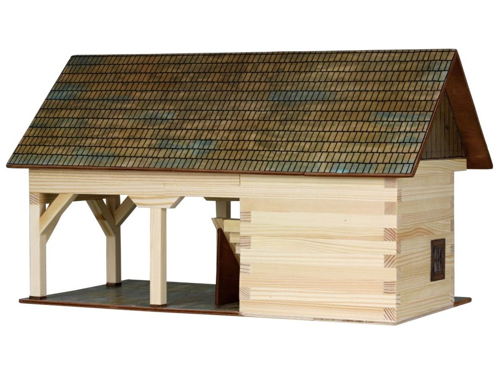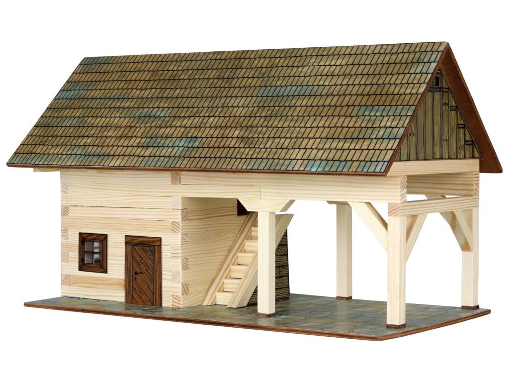 Dřevěná slepovací stavebnice Walachia - Kolna. Slepovací stavebnice Walachia jsou dřevěné modely domečků a staveb z Valašského kraje v měřítku 1:32. Základem jsou dřevěné hranolky 9x9 mm a k tomu jsou v sadě vždy všechny papírové doplňky - okna, dveře, střešní části atd. Pro lepení se používá lepidlo Herkules, není však součástí stavebnice. Přiložený je montážní návod a malé kapitoly z historie lidové architektury. Níže je označení obtížnosti číslem 1 - 5, přičemž 1 je nejlehčí. Rozměry: 34 x 18 x 19 cm. Počet dílů: 131. Obtížnost: 3