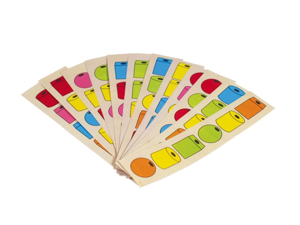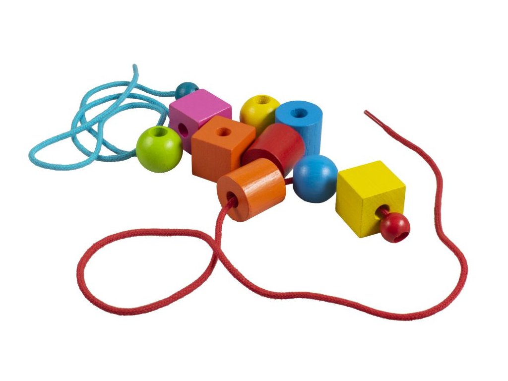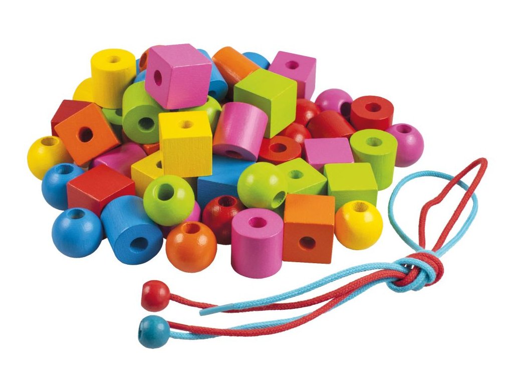 Dřevěné maxiperle různých tvarů o průměru 20 mm se šňůrkou na navlékání v plastovém kyblíku.
