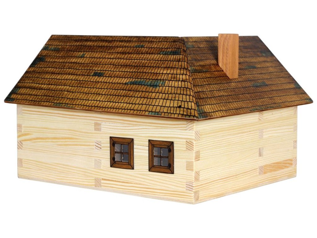 Dřevěná slepovací stavebnice Walachia - Samota. Slepovací stavebnice Walachia jsou dřevěné modely domečků a staveb z Valašského kraje v měřítku 1:32. Základem jsou dřevěné hranolky 9x9 mm a k tomu jsou v sadě vždy všechny papírové doplňky - okna, dveře, střešní části atd. Pro lepení se používá lepidlo Herkules, není však součástí stavebnice. Přiložený je montážní návod a malé kapitoly z historie lidové architektury. Níže je označení obtížnosti číslem 1 - 5, přičemž 1 je nejlehčí. Rozměry: 24 x 20 x 15 cm. Počet dílů stavebnice: 154. Obtížnost: 3