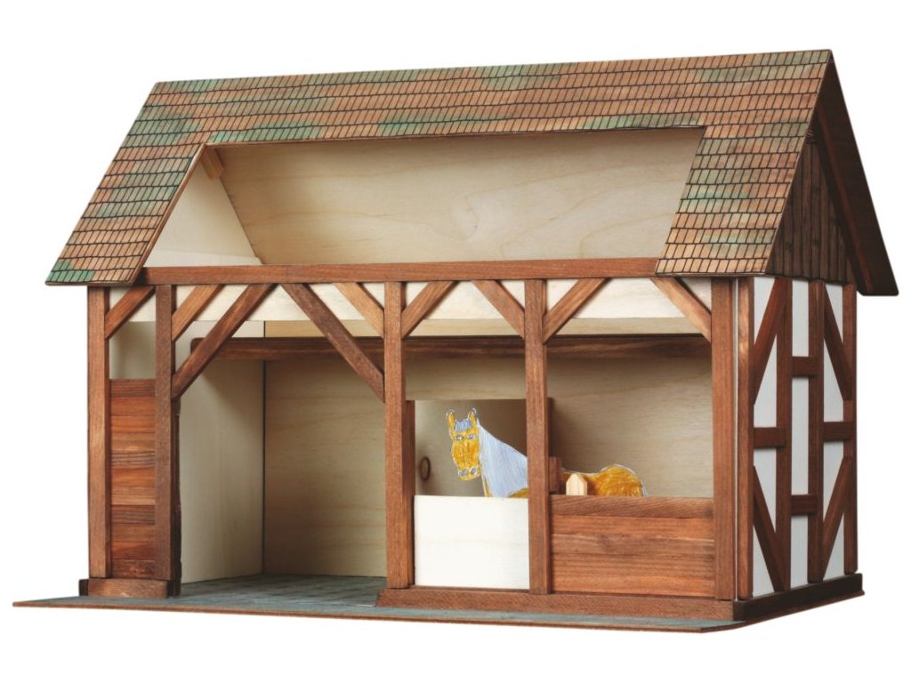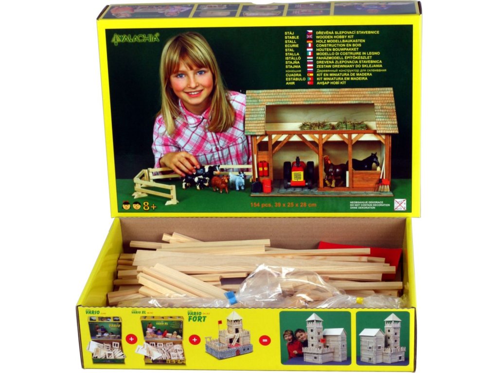 Dřevěná slepovací stavebnice Walachia - Stáj. Slepovací stavebnice Walachia jsou dřevěné modely domečků a staveb z Valašského kraje v měřítku 1:32. Základem jsou dřevěné hranolky 9x9 mm a k tomu jsou v sadě vždy všechny papírové doplňky - okna, dveře, střešní části atd. Pro lepení se používá lepidlo Herkules, není však součástí stavebnice. Přiložený je montážní návod a malé kapitoly z historie lidové architektury. Rozměry: 39 x 25 x 28 cm. Počet dílů stavebnice: 154