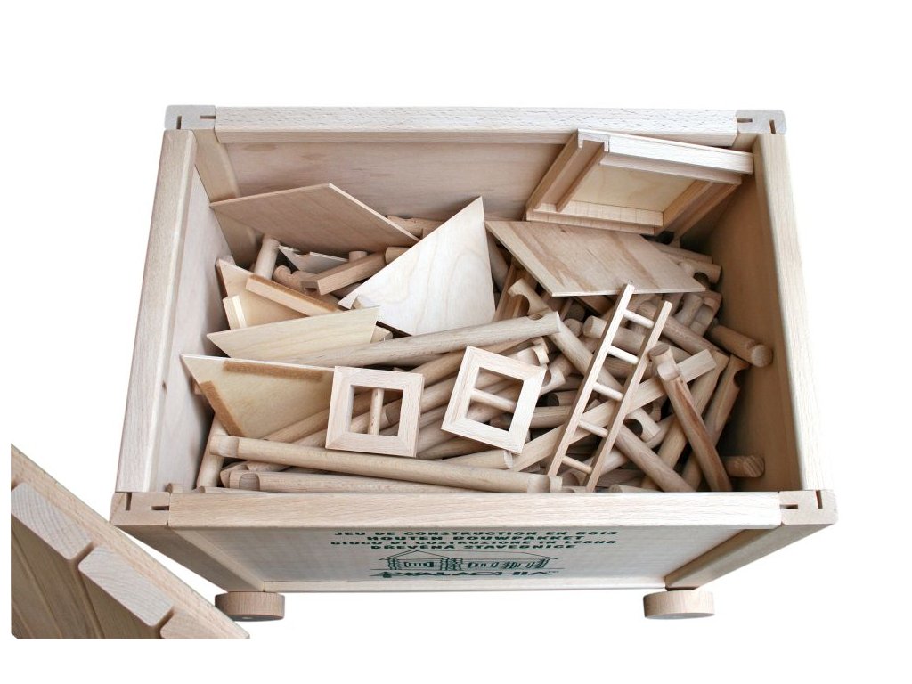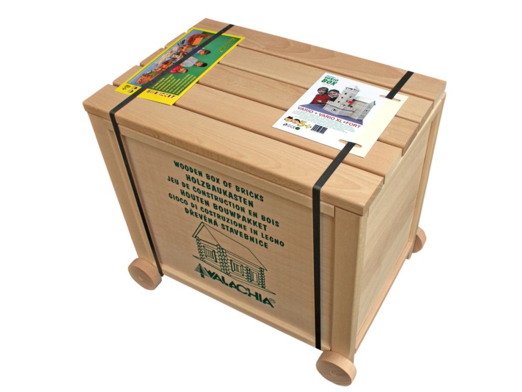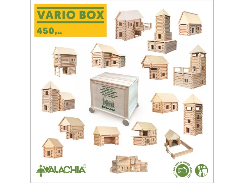 Vario Box 450 dílků stavebnice Walachia. Krabice je z bukového masivního dřeva a překližky. Velkou výhodou všech VARIO stavebnic je jejich vzájemná kombinovatelnost, takže ve spojení se stavebnicí VARIO a VARIO XL lze postavit skutečně monumentální stavby dle vlastní fantazie. Stavebnice z masivního bukového dřeva ( průměr 15 mm ). Lze ji skládat i rozkládat.